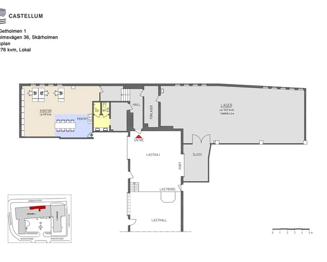 Lokalen är disponerad med en tydlig uppdelning mellan lager och kontor. Lagerdelen har generös takhöjd och är direkt kopplad till sluss, port och lastkaj för smidiga leveranser.