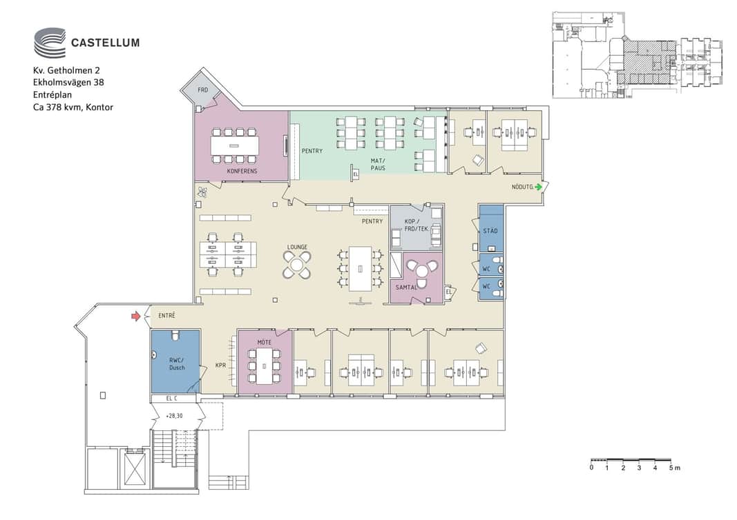Här får ni som hyresgäst en planlösningen bestående av ett flertal kontorsrum med glaspartier som släpper igenom ljuset ut mot lokalen, några konferensrum och en mittkärna med pentry.