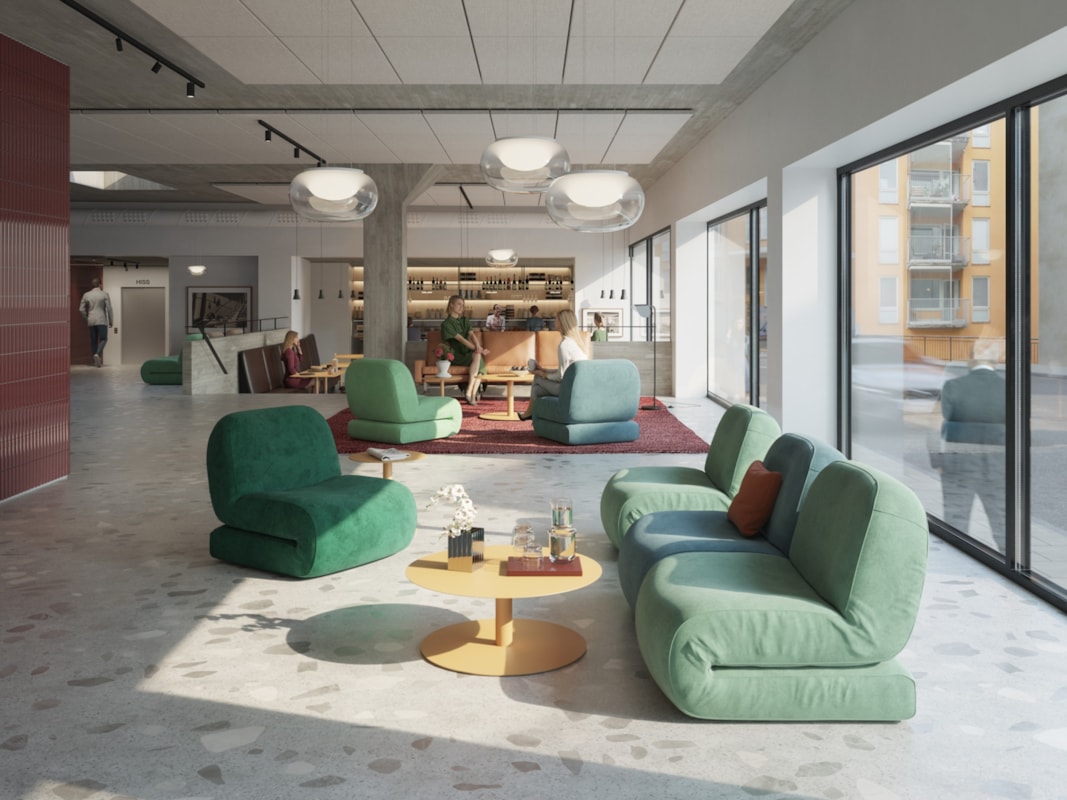 Den tidstypiska arkitekturen och den generösa fönstersättningen längst fasaden i kombination med det nya interiöra lösningarna skapas en fin och mjuk upplevelse.