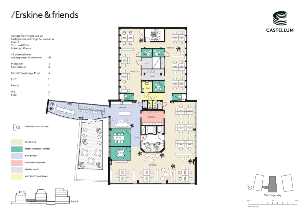 I Erskine & friends kommer ni som sätter extra stort värde på en trevlig arbetsmiljö och representativa lokaler att trivas. Kombinationen av egna kontorsytor, delade servicefunktioner, gemensam takterrass och restaurang och café i huset, ger också en flexibilitet som får de ljusa och smarta ytorna att kännas ännu större.