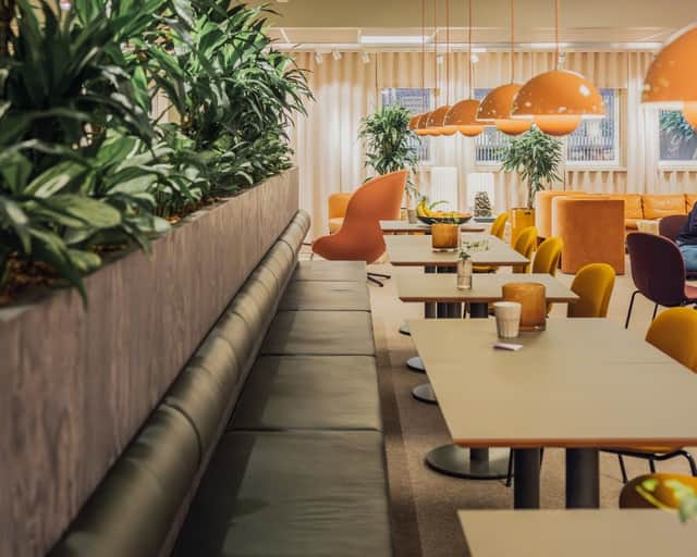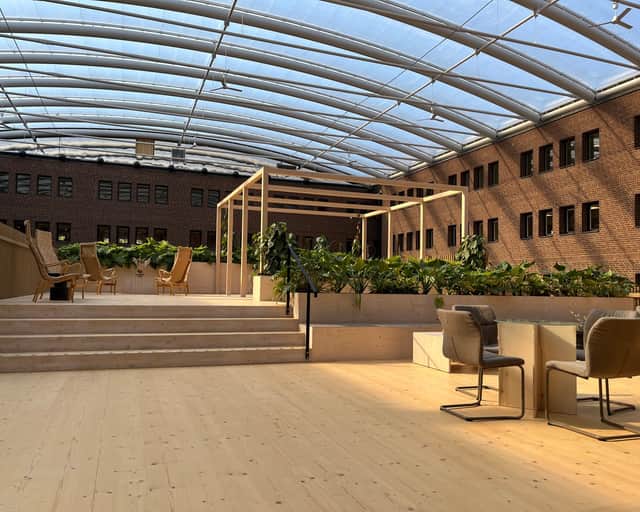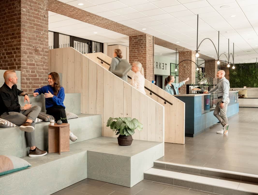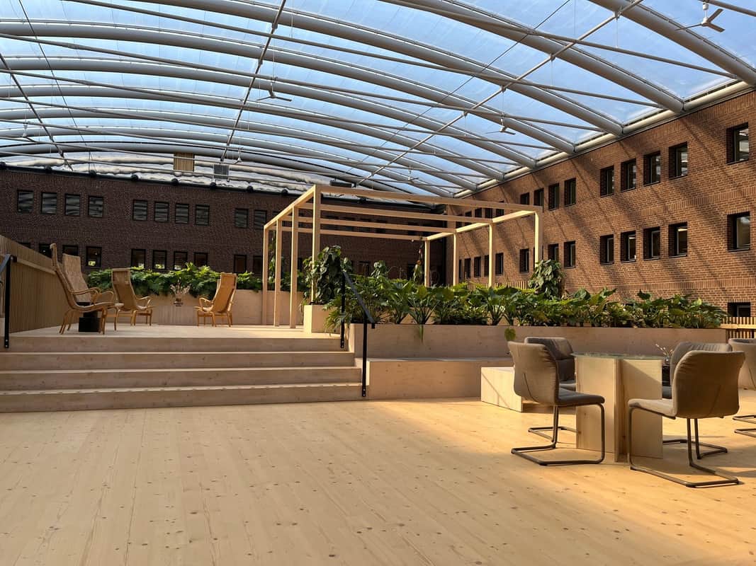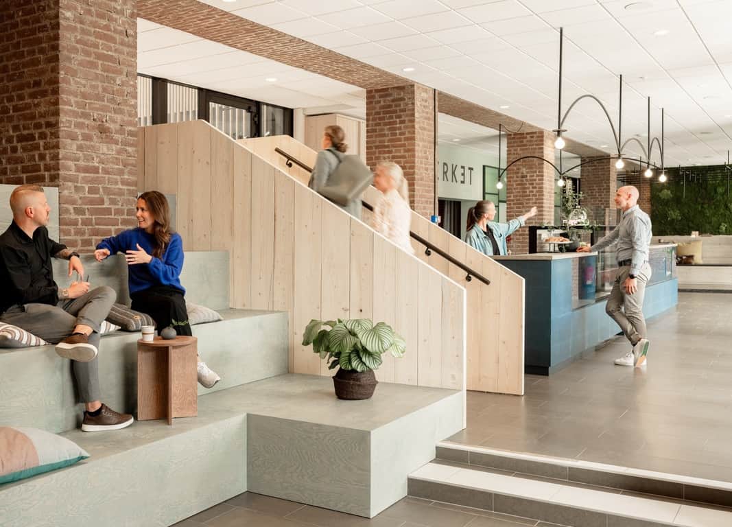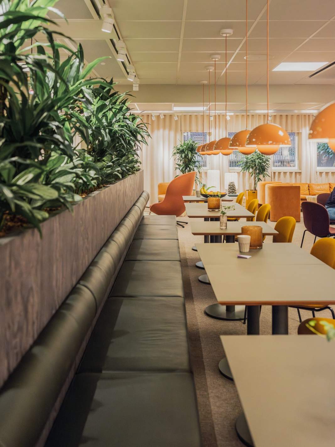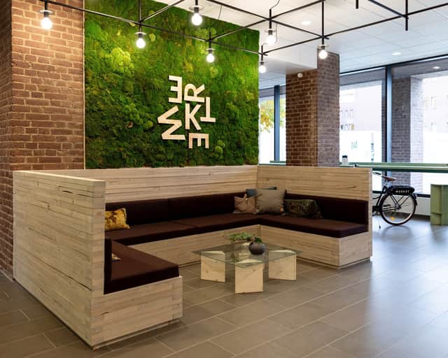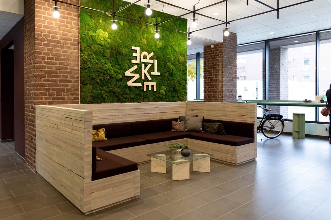 På Werket är det fokus på hållbarhet och hälsa ur alla aspekter. Inredningskonceptet är framtaget utifrån grunderna i neurodesign, med naturnära färger, naturligt ljus och gröna växter. Det gör hjärnan mer kreativ och välmående, enligt forskarna. Och sen är det rätt trevligt med fågelkvitter på toaletten.