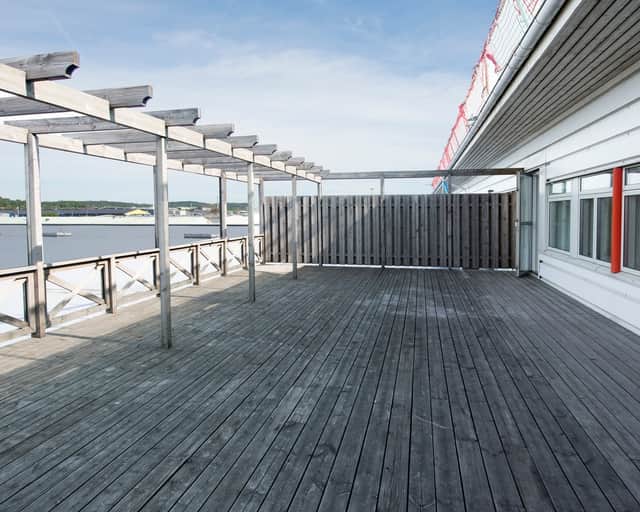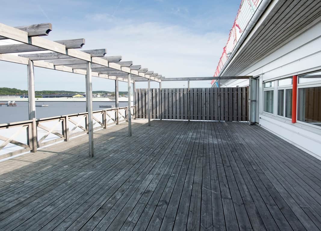 Lokalen har mycket ljusinsläpp med fönster i tre väderstreck och utsikt mot vattnet. Parkeringsplatser intill fastigheten och hiss i båda entréerna. En härligt rymlig takterrass för lunch och fika utomhus under sommarhalvåret och för sociala aktiviteter.