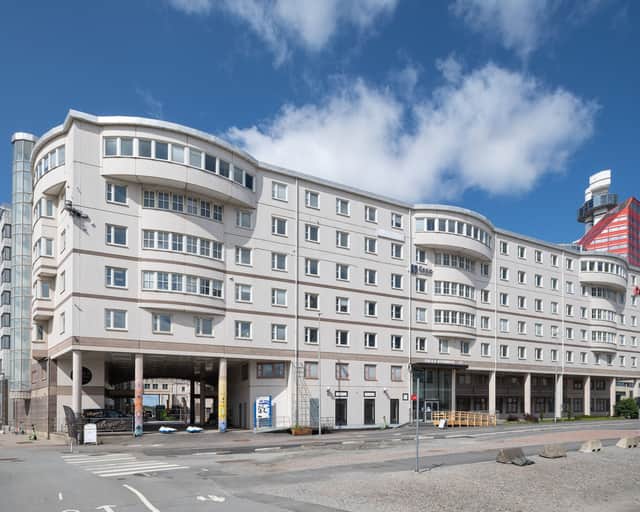 Fastighet i åtta våningsplan som består av kontor och ett fåtal butiker. Tegelbyggnad med vissa burspåksfönster.