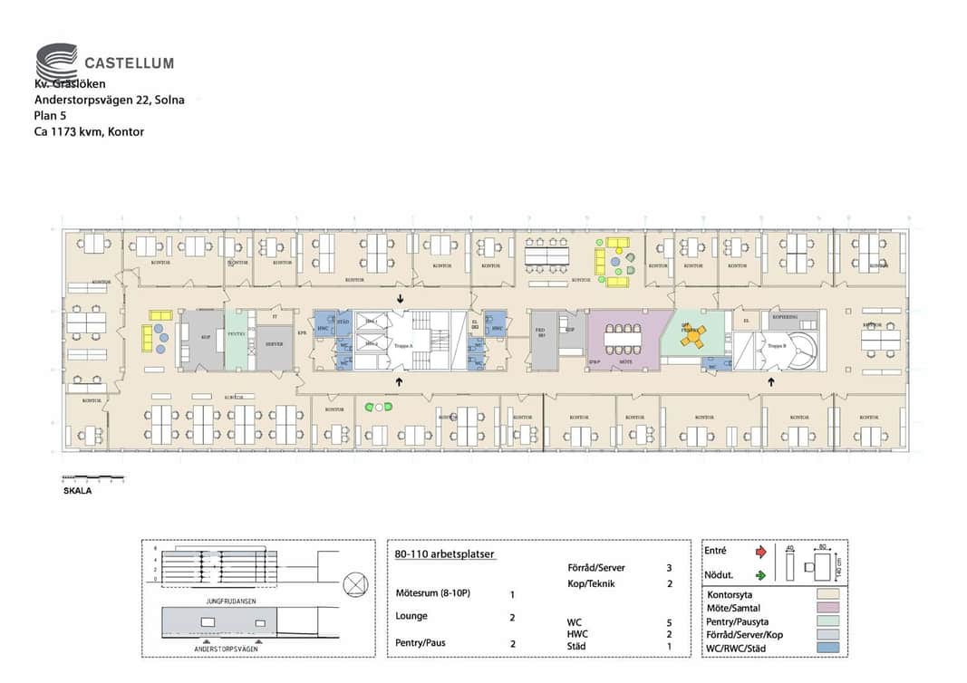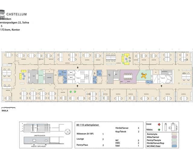 Både tunnelbana och buss ligger endast några minuters promenad från ditt kontor. Tar du bilen ligger de stora lederna E:4an och E:18 precis intill. Solna Centrum har du på 5 minuters promenadavstånd. Inom10 min är du i Stockholm city och på en halvtimme så är du redo att ta flyget på Arlanda. Sundbybergs centrum ligger bara ett stenkast från ditt kontor och här tar du enkelt både pendeltåg, tvärbanan, bussar, fjärrtåg och t-banan och samtidigt kan du göra alla dina ärenden eftersom all service du behöver finns lättillgängligt.