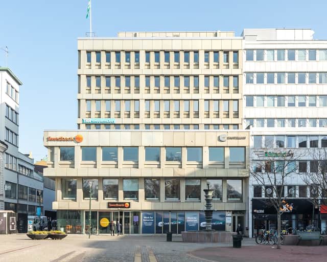 Fräscha kontorslokaler på en av Malmös absolut bästa adresser mitt i stadens shoppingstråk. I omedelbar anslutning till all tänkbar service och så gott som samtliga busslinjer vid Gustav Adolfs torg. Sjuttiotalshus, med fasad i aluminiumplåt, som smälter väl in i torgets blandning av funkishus och jugendpalats. Byggnaden är miljöklassad enligt EU GreenBuilding