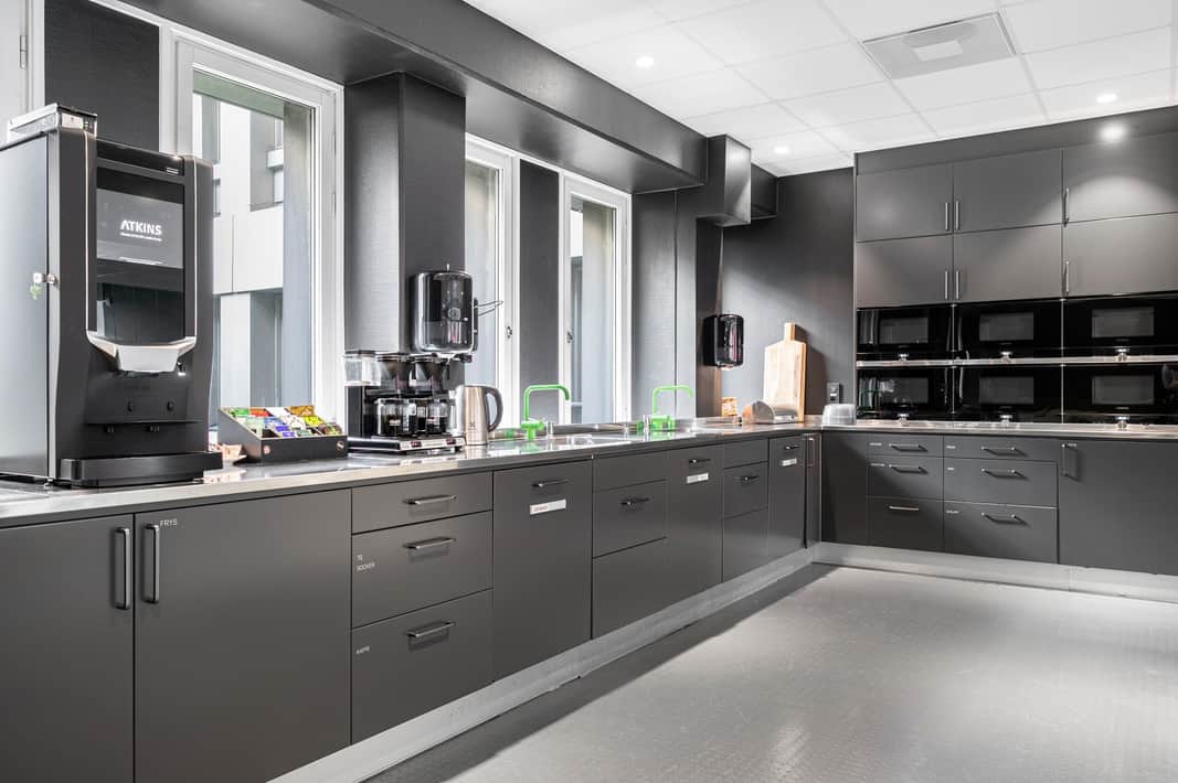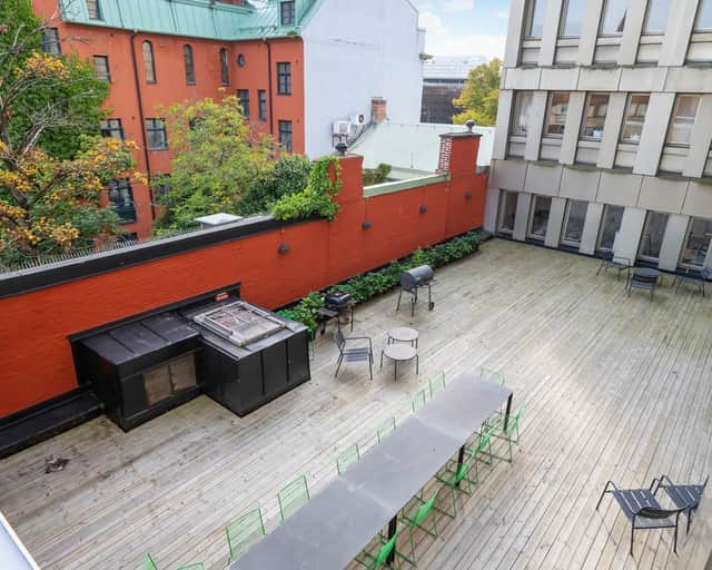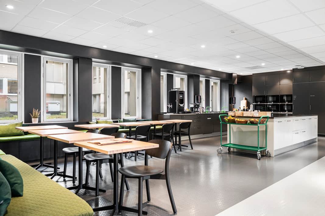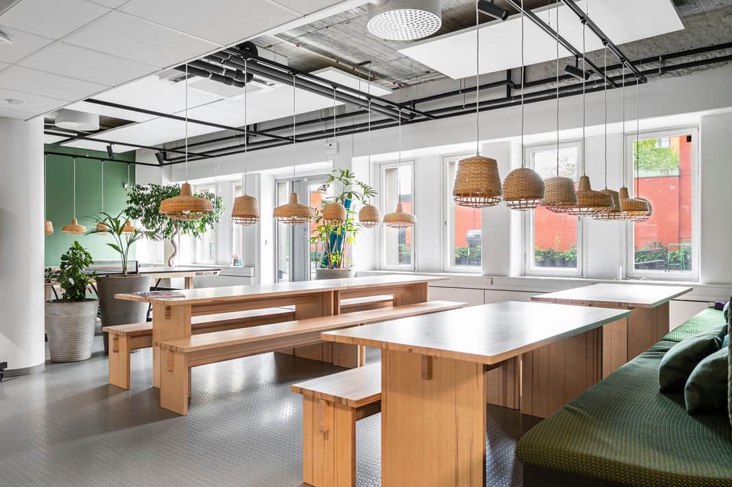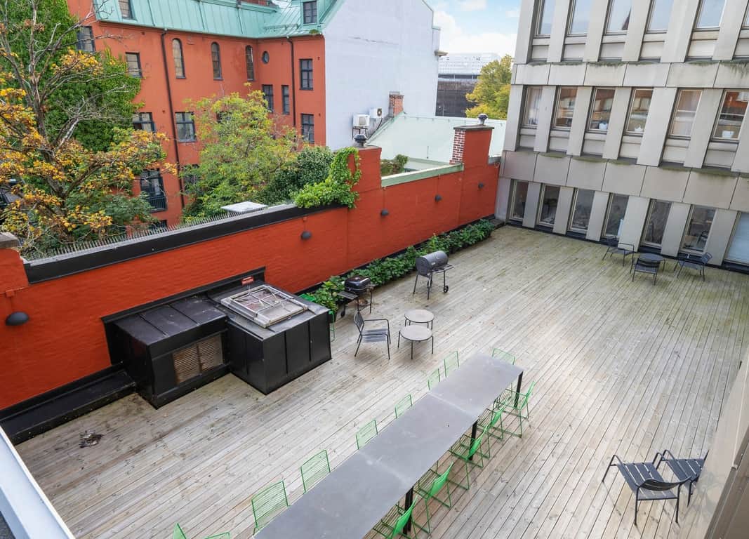 Hjärtat i lokalen är den generösa matsalen, där stora fönsterpartier och direkt access till den privata terrassen skapar en naturlig samlingspunkt. Terrassen bjuder in till allt från kreativa workshops och kundmöten i solen till avkopplande pauser med utsikt över stadens liv.
