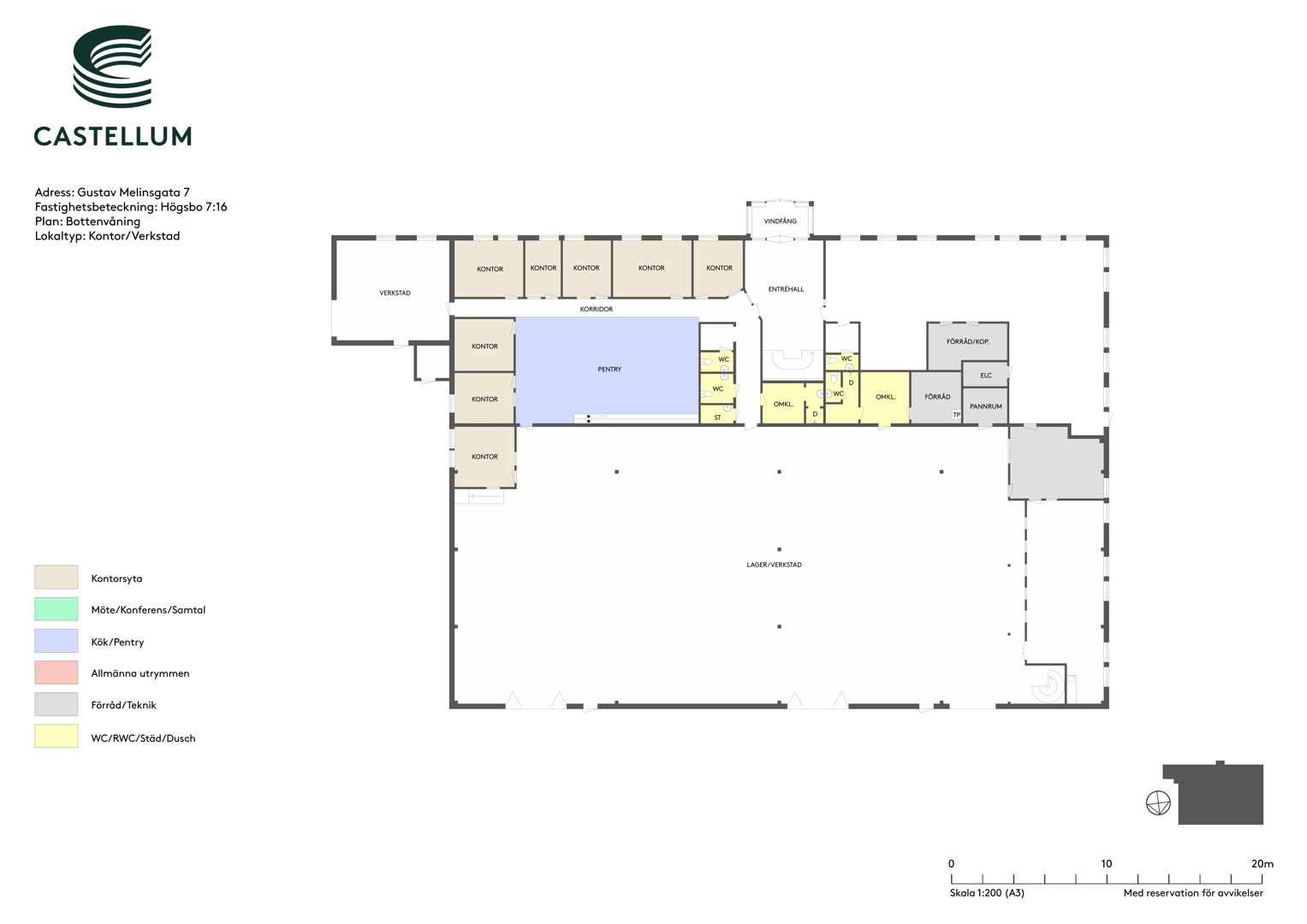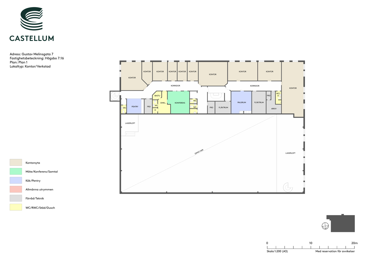 Lokalen erbjuder en välbalanserad kombination av lager, kontor och flexibla ytor. Lagerdelen om cirka 800 kvm är anpassad för höglagring och har direkt access via tre markportar. Kontorsdelen om cirka 1 000 kvm är fördelad på två plan och består huvudsakligen av cellkontor, konferensrum och pentry, kompletterat med öppna ytor för samarbete.