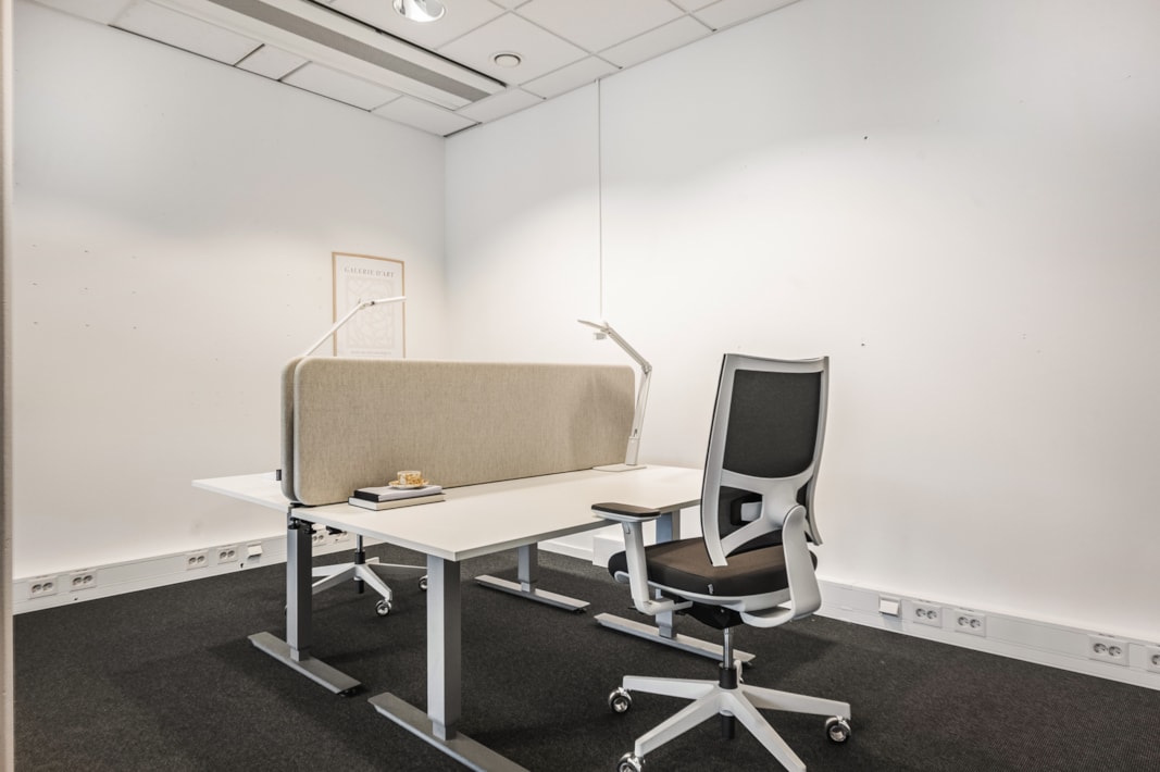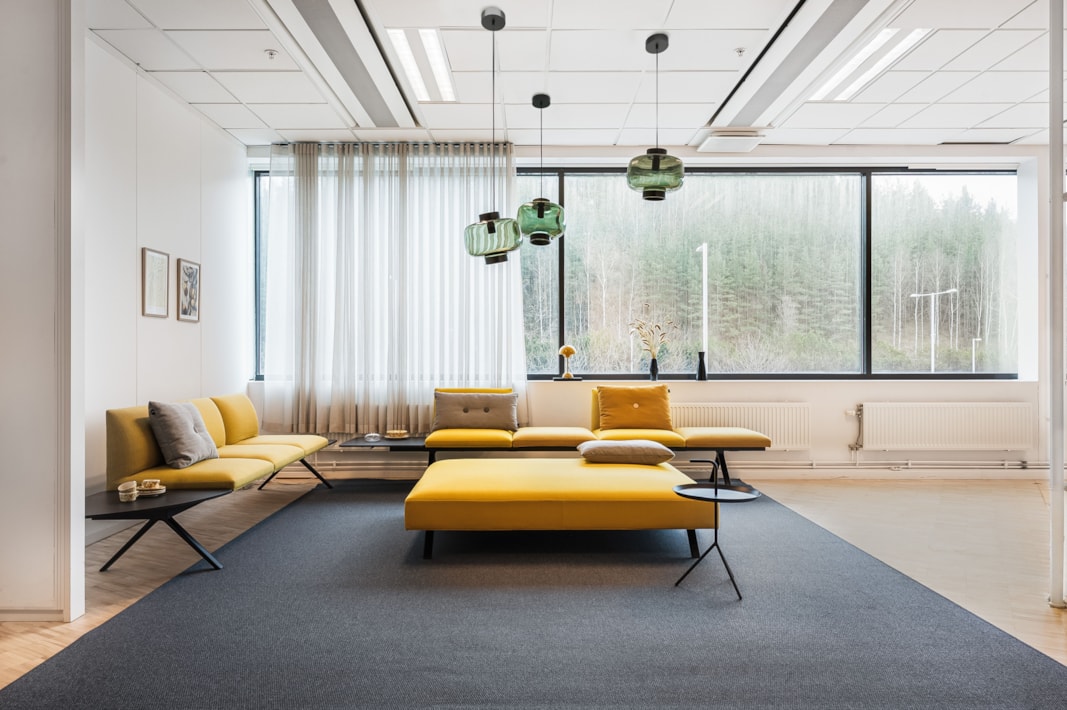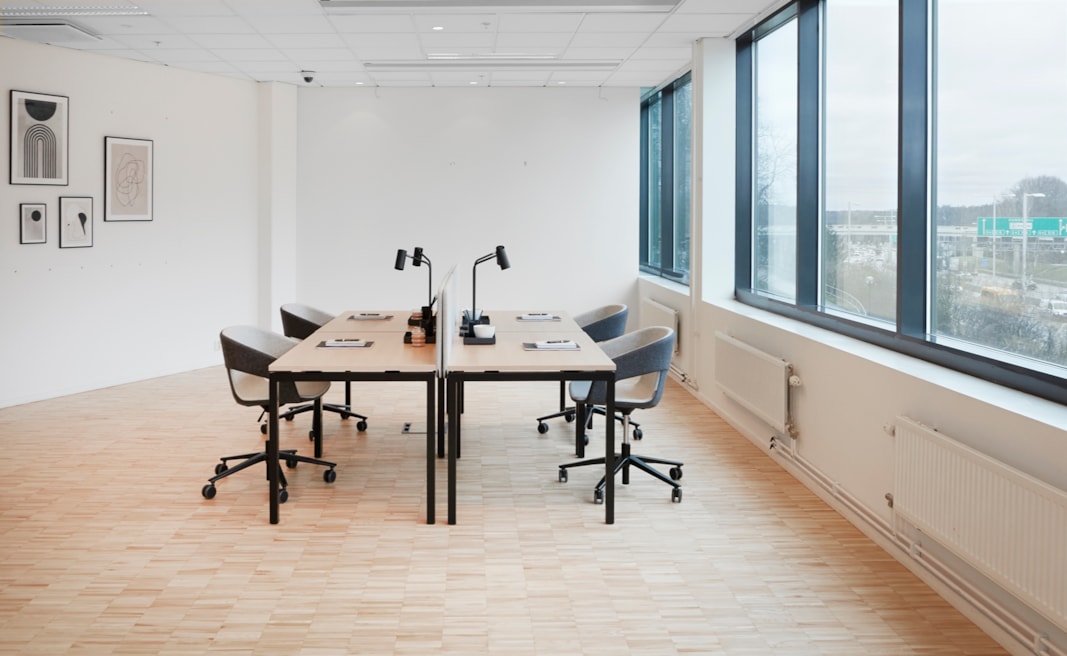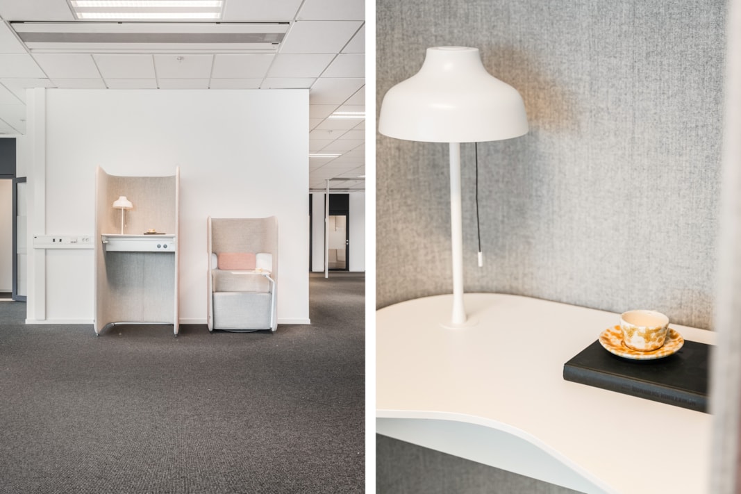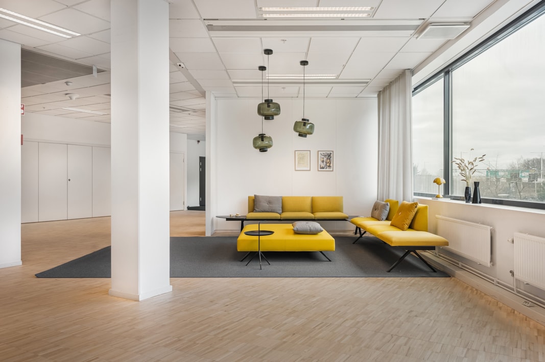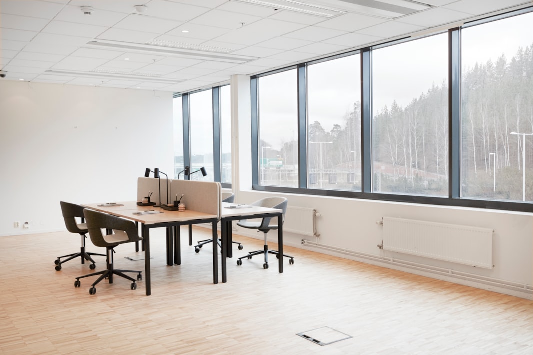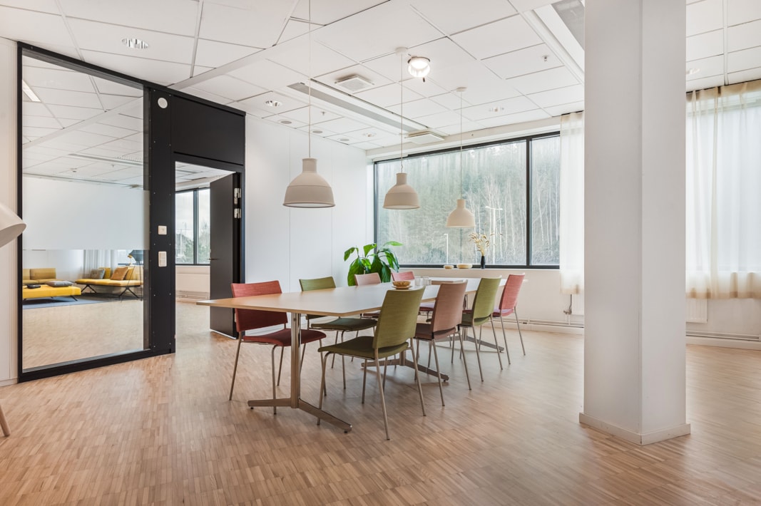 De stora fönsterna ger ett behagligt ljusinsläpp och skapar tillsammans med de ljusa ytskikten en trevlig arbetsmiljö. Den generösa takhöjden och de öppna ytorna ger lokalen en härlig rymd.