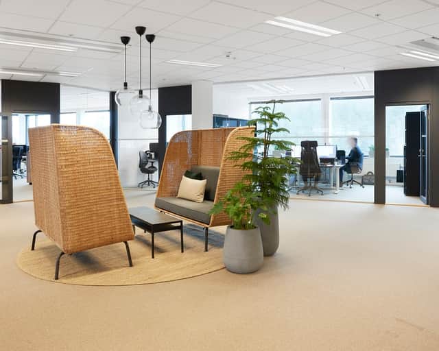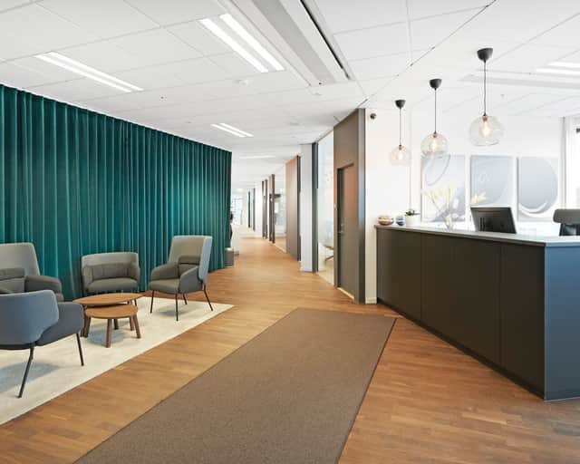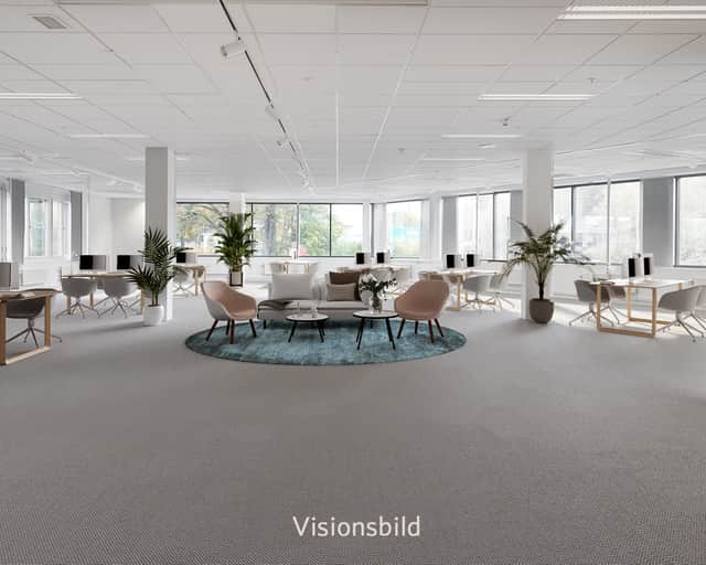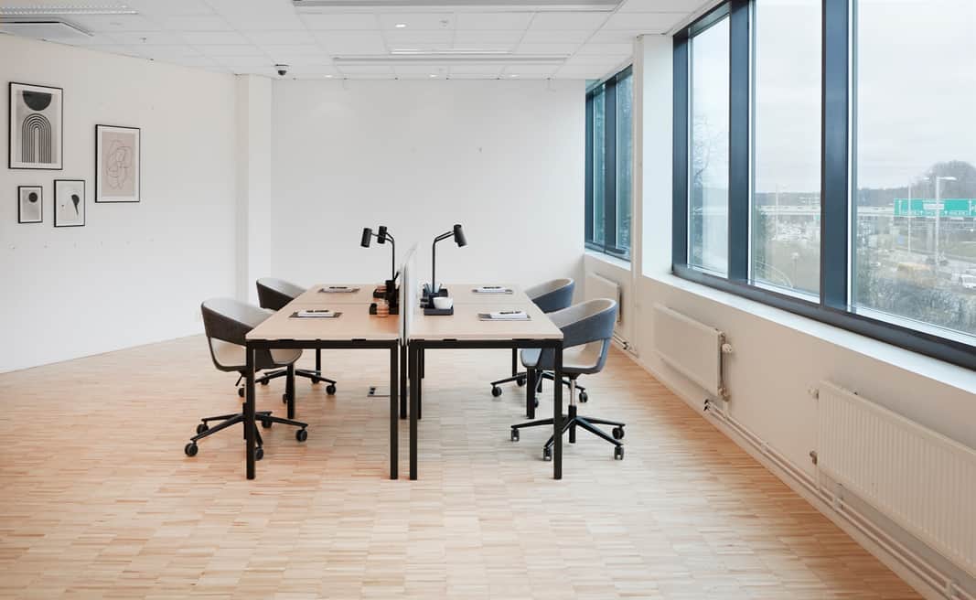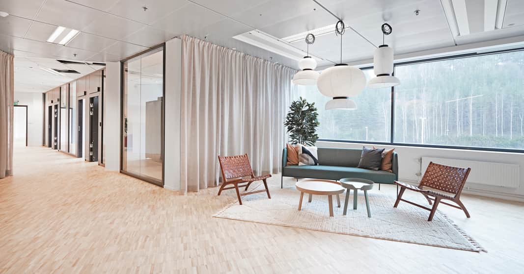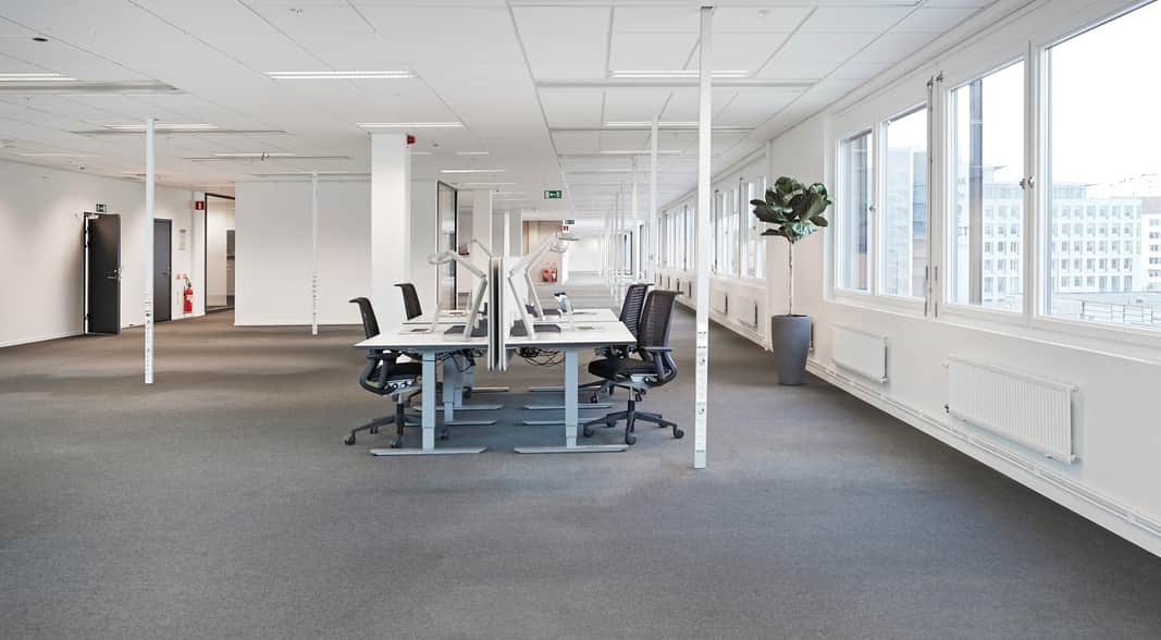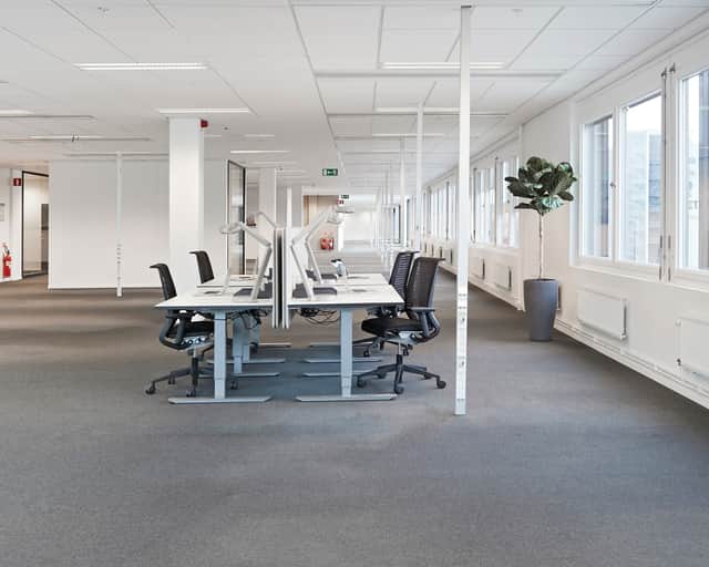 De stora fönsterna ger ett behagligt ljusinsläpp och skapar tillsammans med de ljusa ytskikten en trevlig arbetsmiljö. Den generösa takhöjden och de öppna ytorna ger lokalen en härlig rymd.