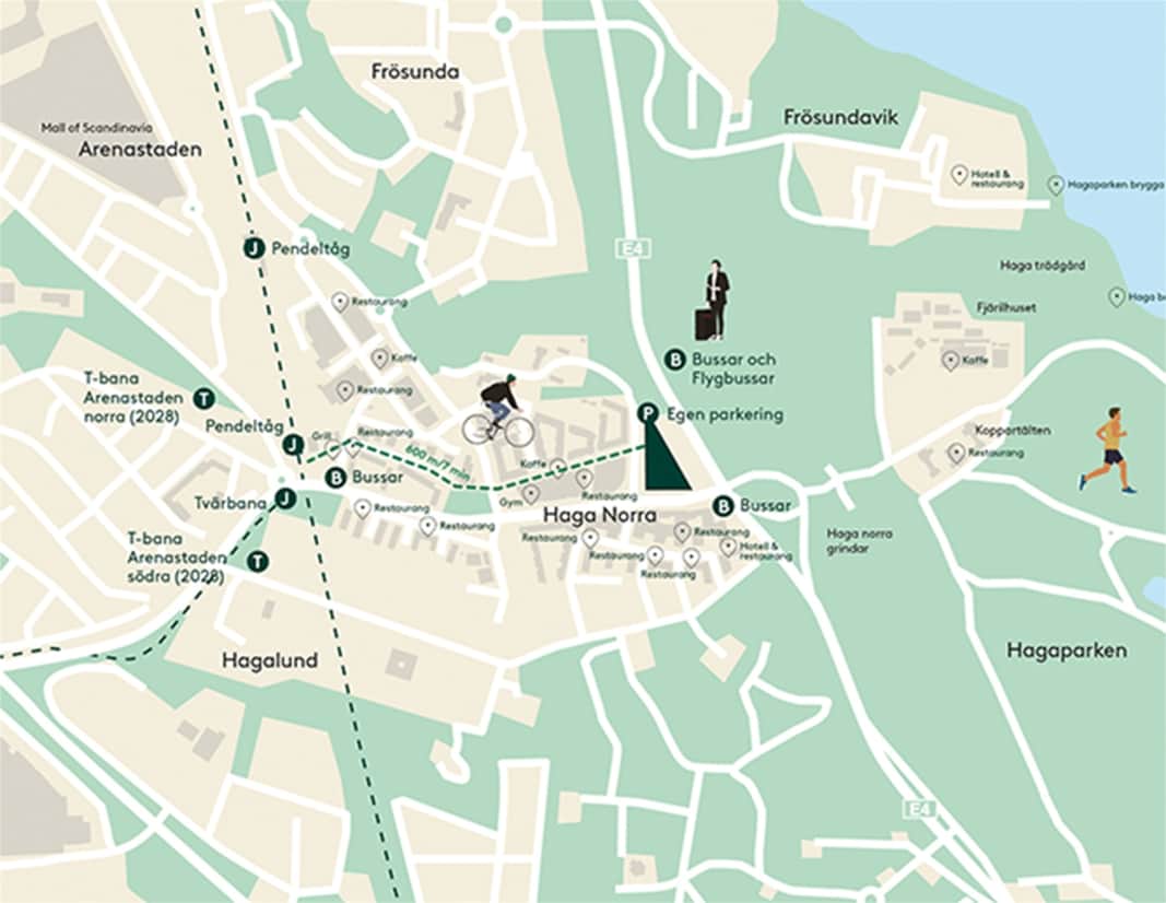 Frösunda/Haga Norra erbjuder ett av de mest attraktiva lägena i både Solna och Stockholm – en plats där allt du behöver finns precis utanför dörren. Området kombinerar en dynamisk stads-miljö med naturnära grönområden, vilket skapar en perfekt balans för både arbete och välbefin-nande.