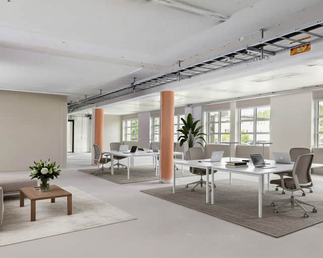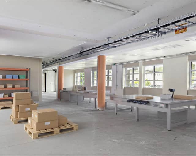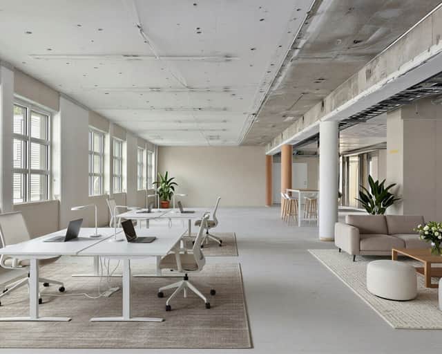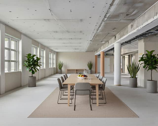 Fastigheten har genomgått en omfattande renovering och har en modern, industriell känsla med stora fönster och svarta detaljer.