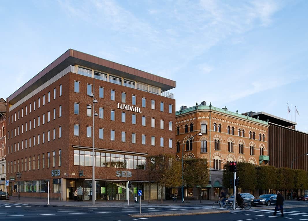 Bankbyggnad i sex plan i brunt hyllingetegel. Arkitekt är Nils Einar Eriksson arkitektkontor AB genom Gunnar Bornö.