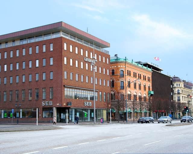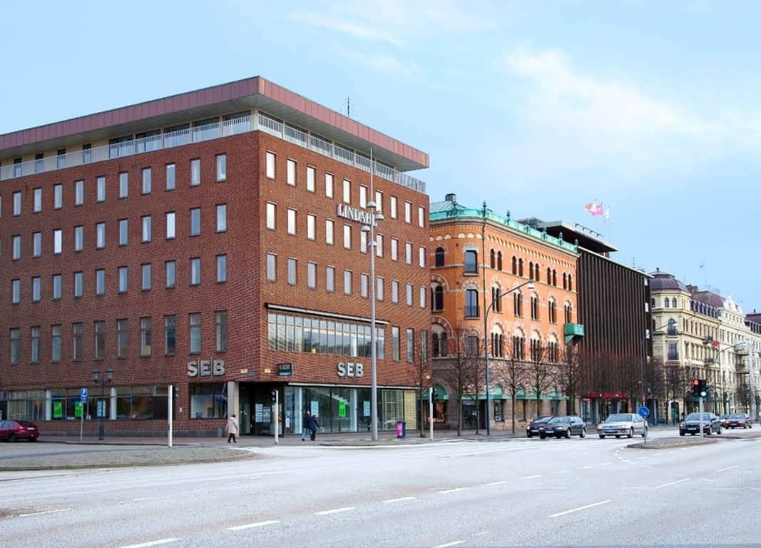Bankbyggnad i sex plan i brunt hyllingetegel. Arkitekt är Nils Einar Eriksson arkitektkontor AB genom Gunnar Bornö.
