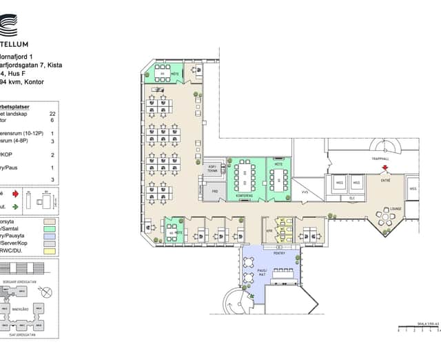 Mot entréområdet återfinns tre mötesrum, varav ett större konferensrum med gott om plats för större sammankomster. Planlösningen erbjuder tydliga flöden och god integritet mellan arbetszoner och sociala ytor, vilket gör lokalen flexibel och enkel att anpassa efter verksamhetens behov.