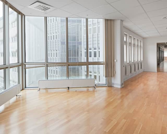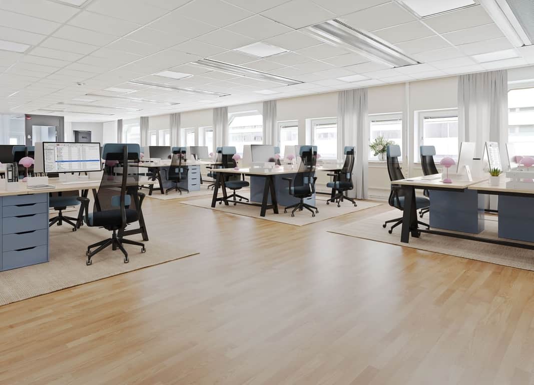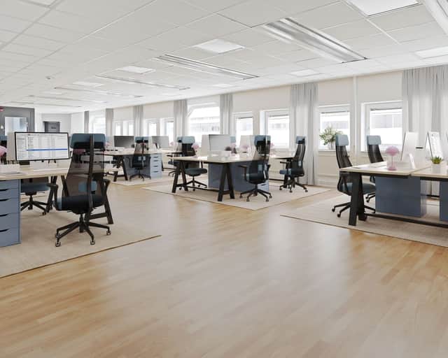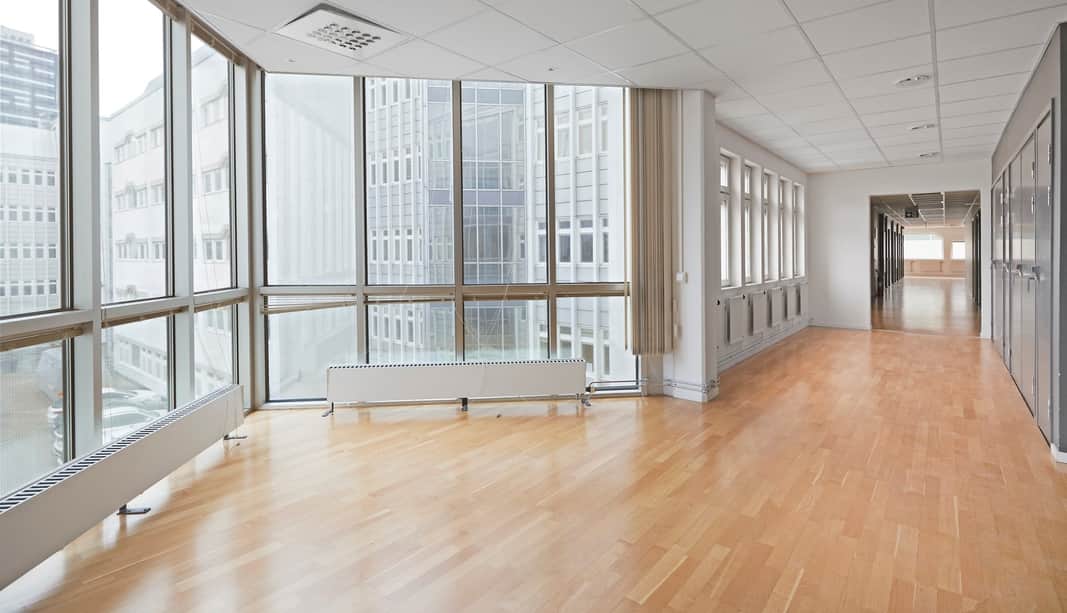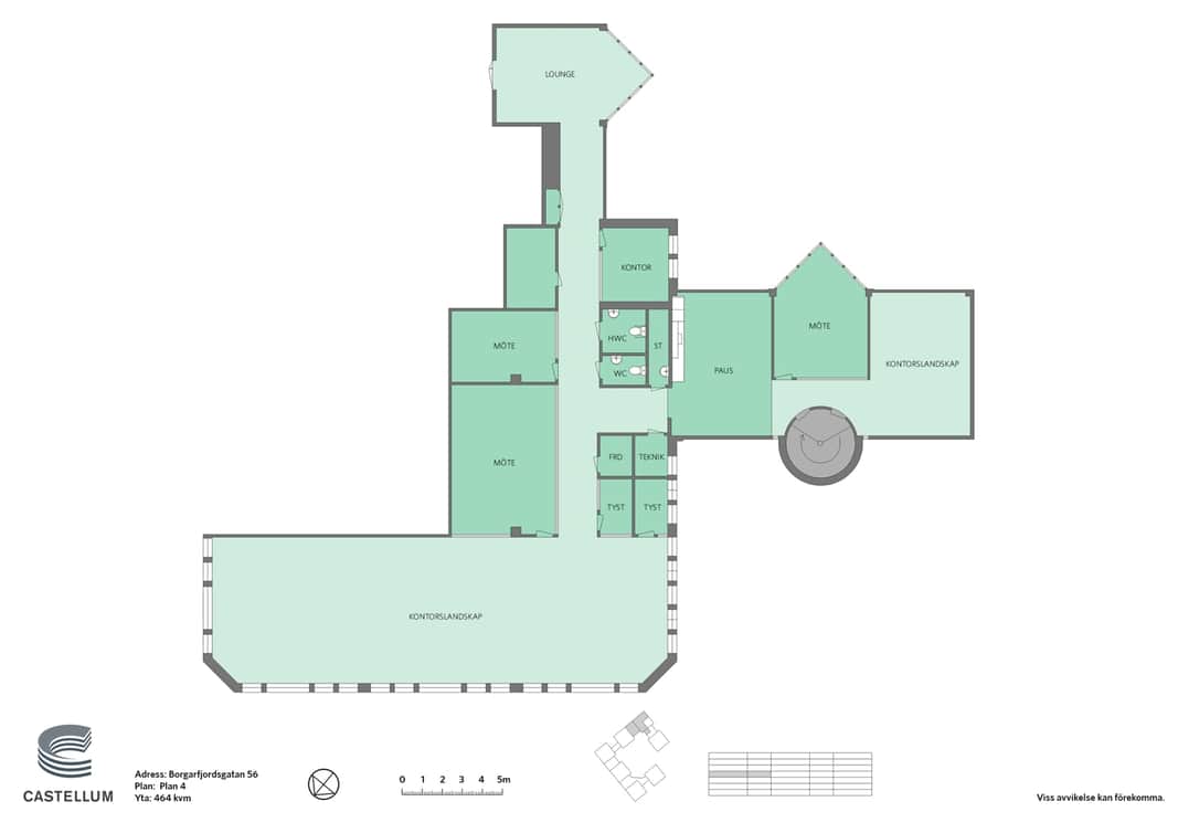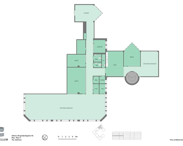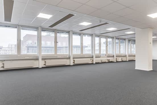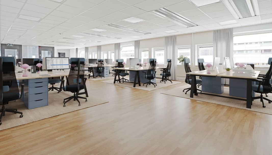6 rum, 1 stort konferensrum och resten öppen yta. Bra planerad. Nära till service.