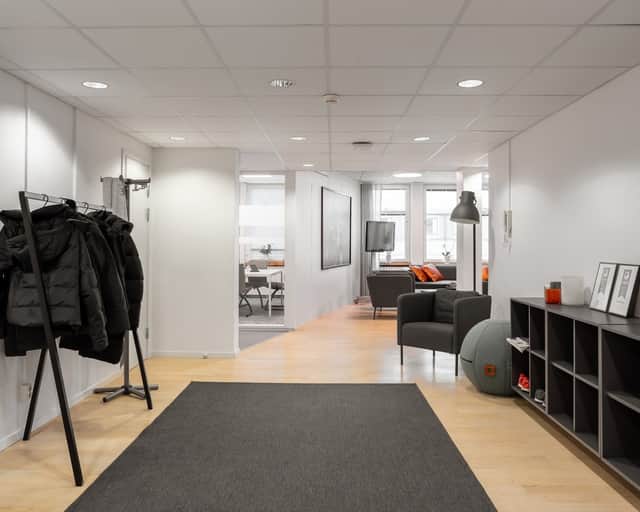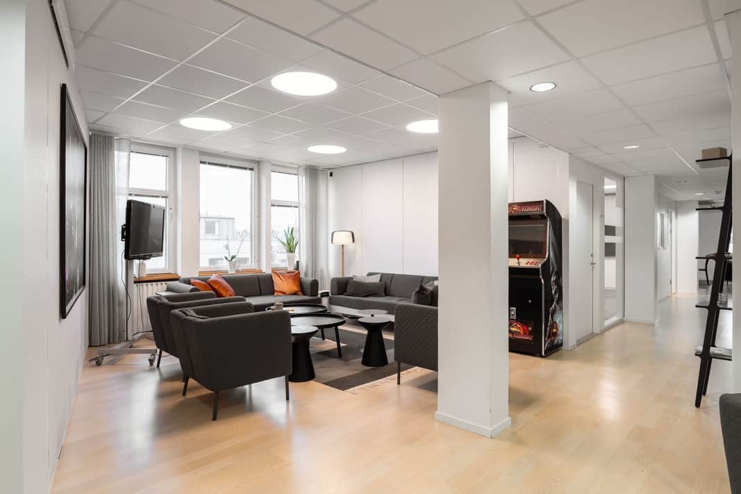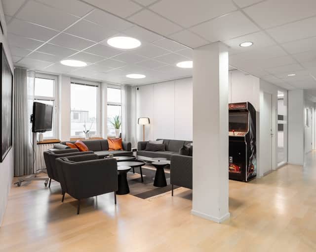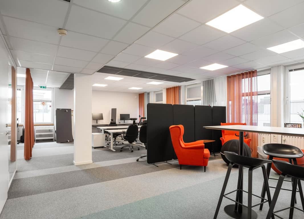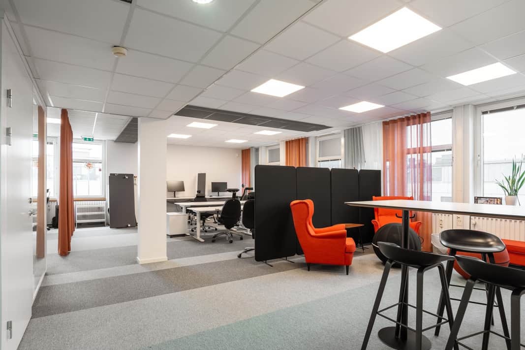 Den öppna planlösningen skapar en modern och flexibel arbetsmiljö där samarbete står i centrum. Här finns gott om plats för arbetsplatser, kompletterat med mötesrum och mindre teamsrum för fokuserade samtal och effektiva möten.