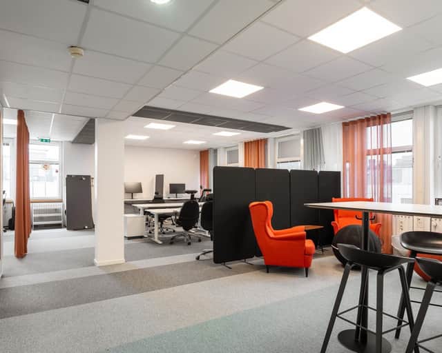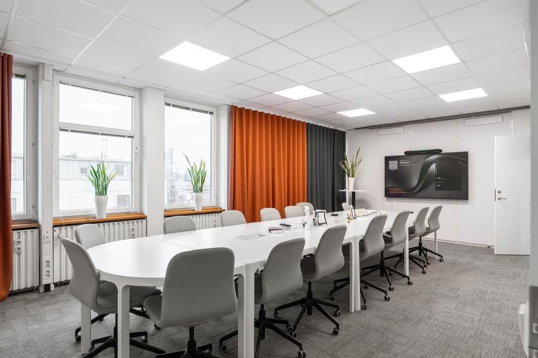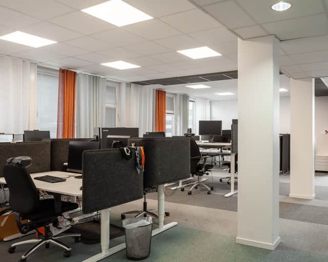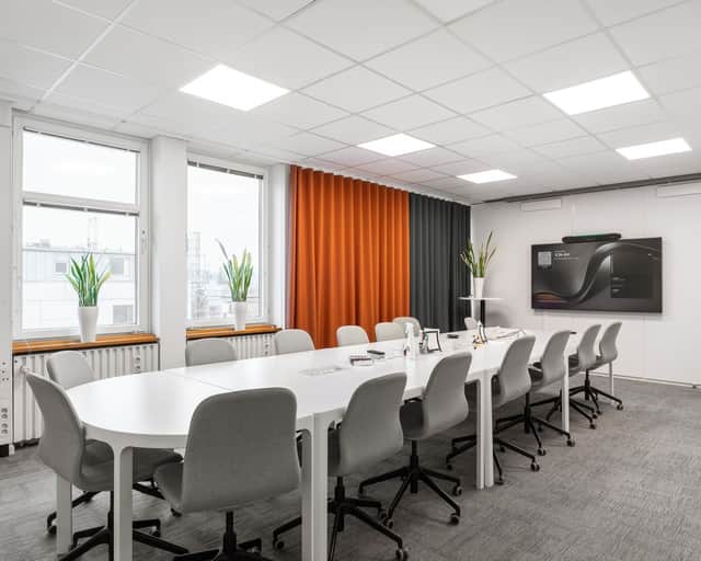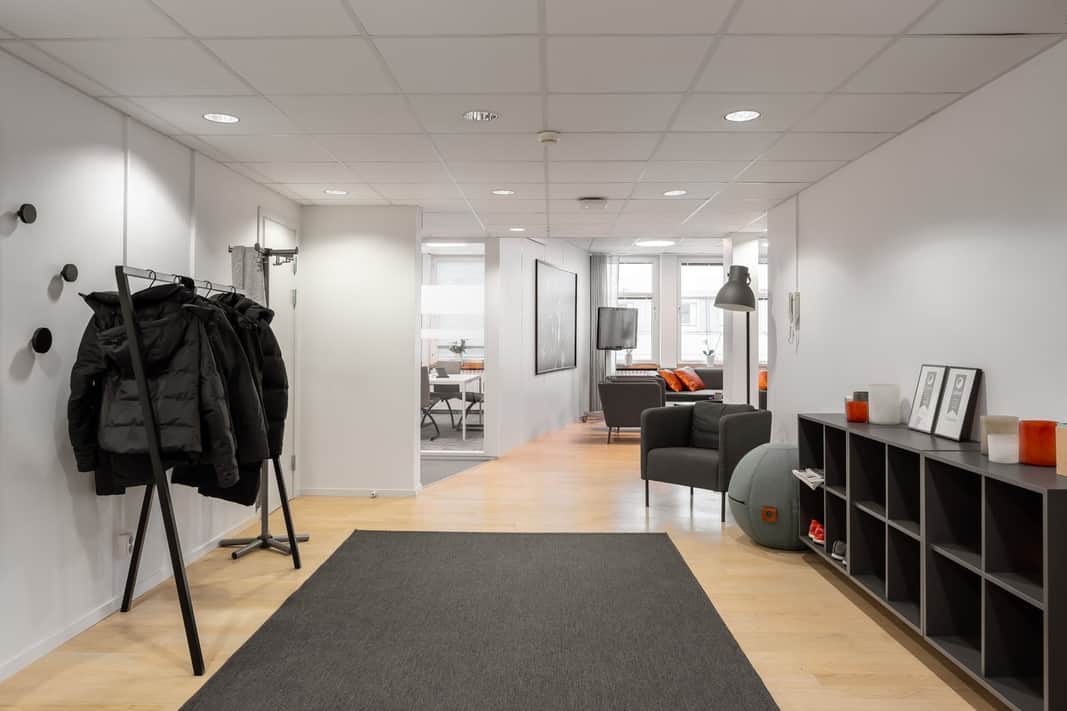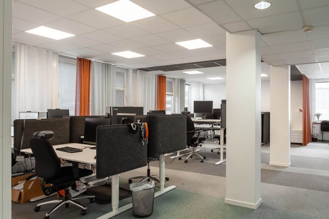 Den öppna planlösningen skapar en modern och flexibel arbetsmiljö där samarbete står i centrum. Här finns gott om plats för arbetsplatser, kompletterat med mötesrum och mindre teamsrum för fokuserade samtal och effektiva möten.