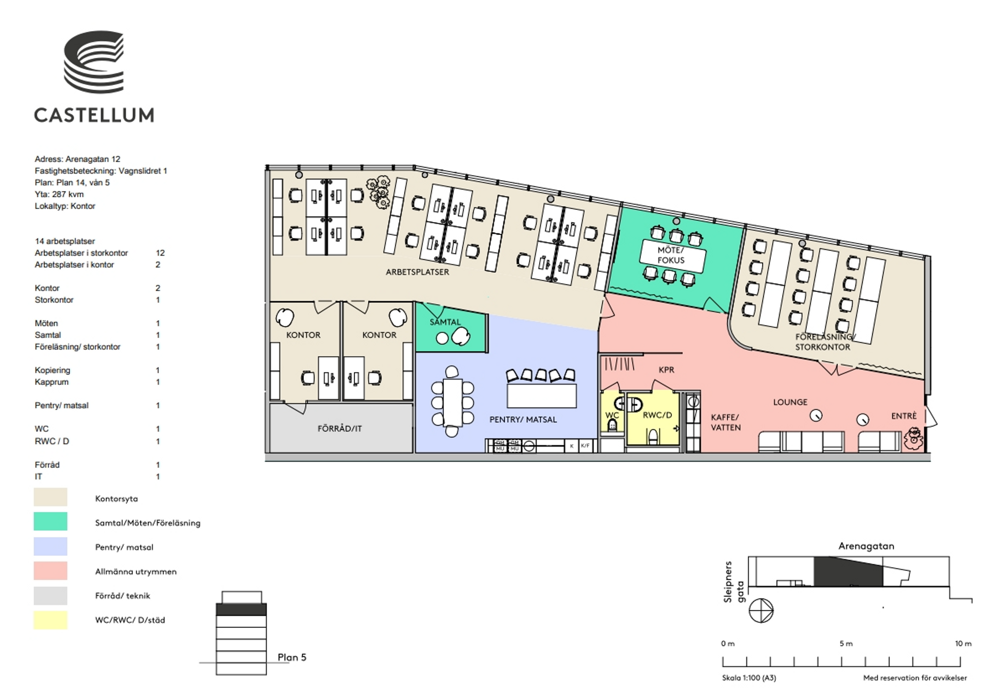 Kontorsfastighet som består av sex våningar plus källare. Bottenvåningen utgörs av butiker och plan 2-6 är kontor i varierande storlekar. Hög kontorsstandard med en takhöjd på 3,5 meter, stora glaspartier samt modern inredning.