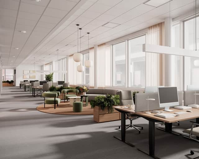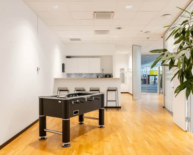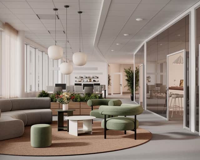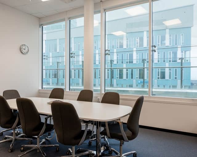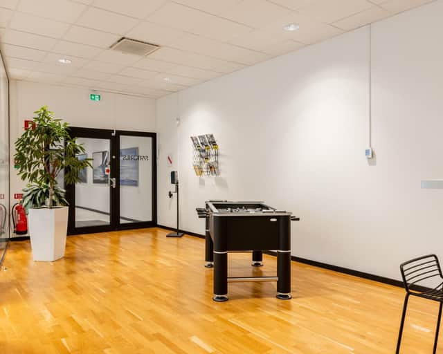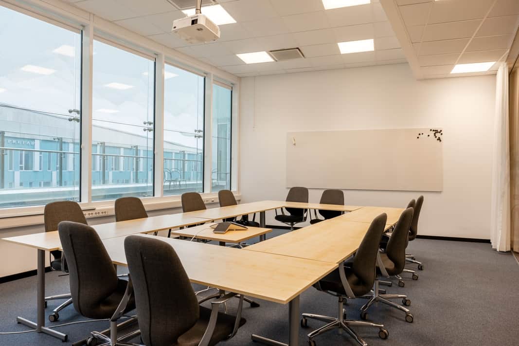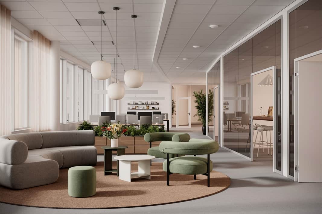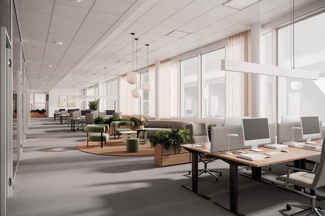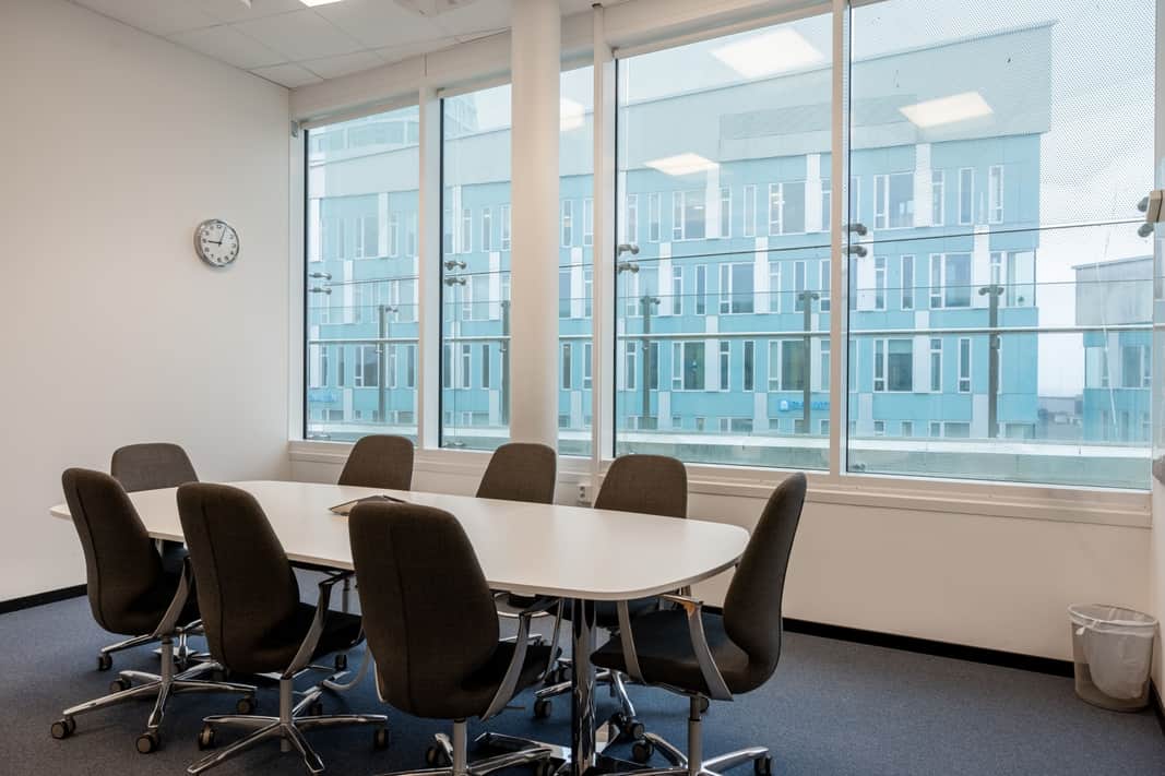 Stora fönster släpper in rikligt med dagsljus och skapar en inspirerande och trivsam arbetsmiljö.