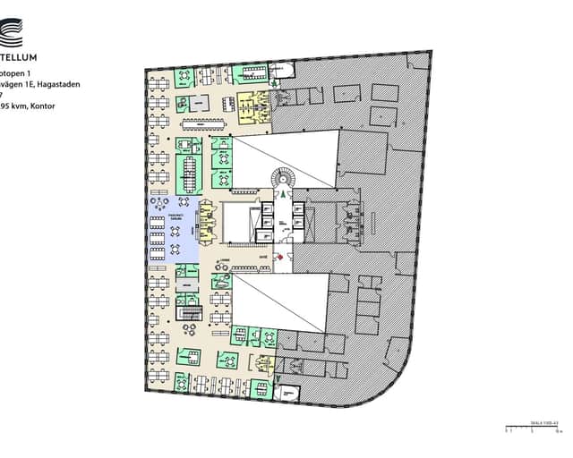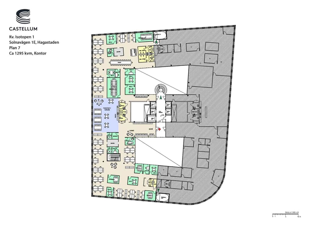Lokalens planlösning är av blandad karaktär. Då den är avknoppad från en större yta så kommer nytt pentry behöva tillskapas. Blandade storlekar av mötesrum finns och layouten går att enpassa efter era behov.