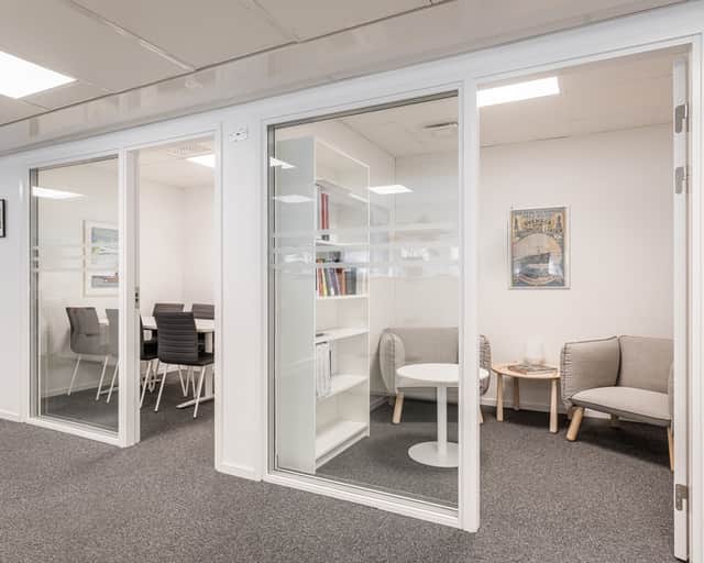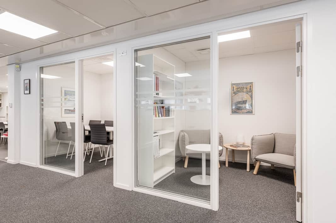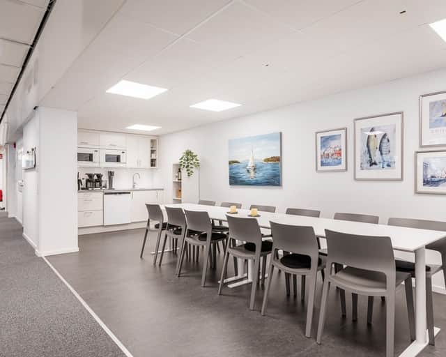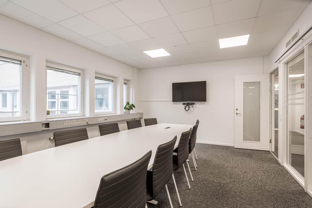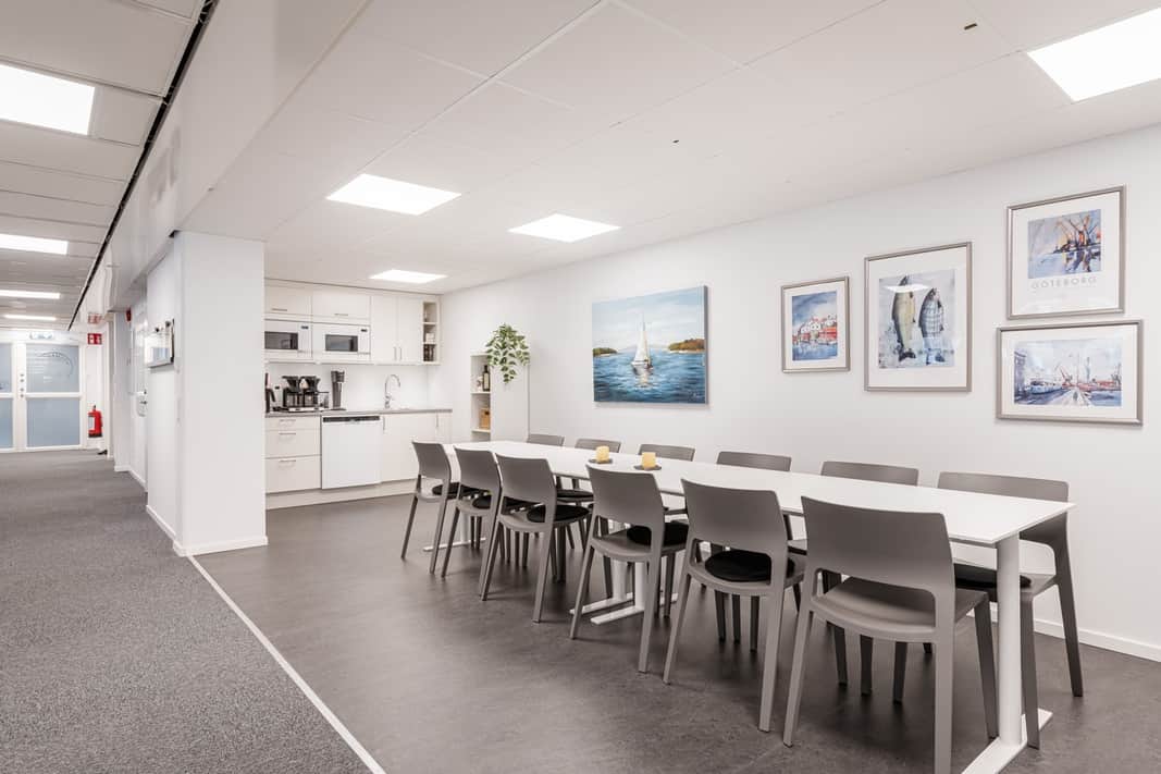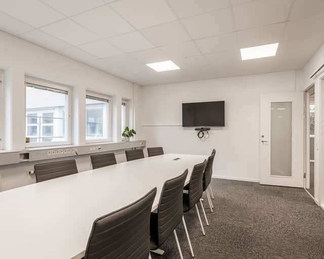 Lokalen har en öppen planlösning med ett stort konferensrum och två mindre samtalsrum – perfekt för både samarbete och avskildhet. Inredningen är smakfull med glaspartier och ljusa färgval vilket skapar en modern och inspirerande arbetsmiljö.