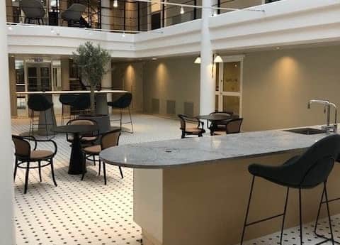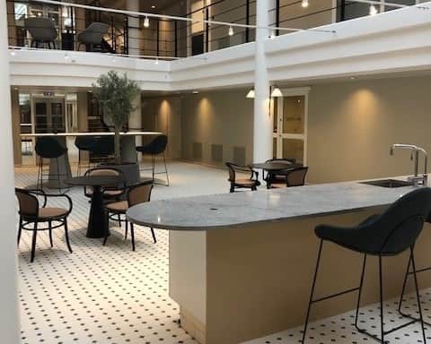 I hjärtat av byggnaden finns en ny, ljus och inbjudande ljusgård som erbjuder en naturlig mötesplats för både spontana samtal och bokade möten. Den passar lika bra för en avkopplande fika som för inspirerande arbetsstunder i en trivsam miljö.