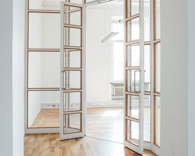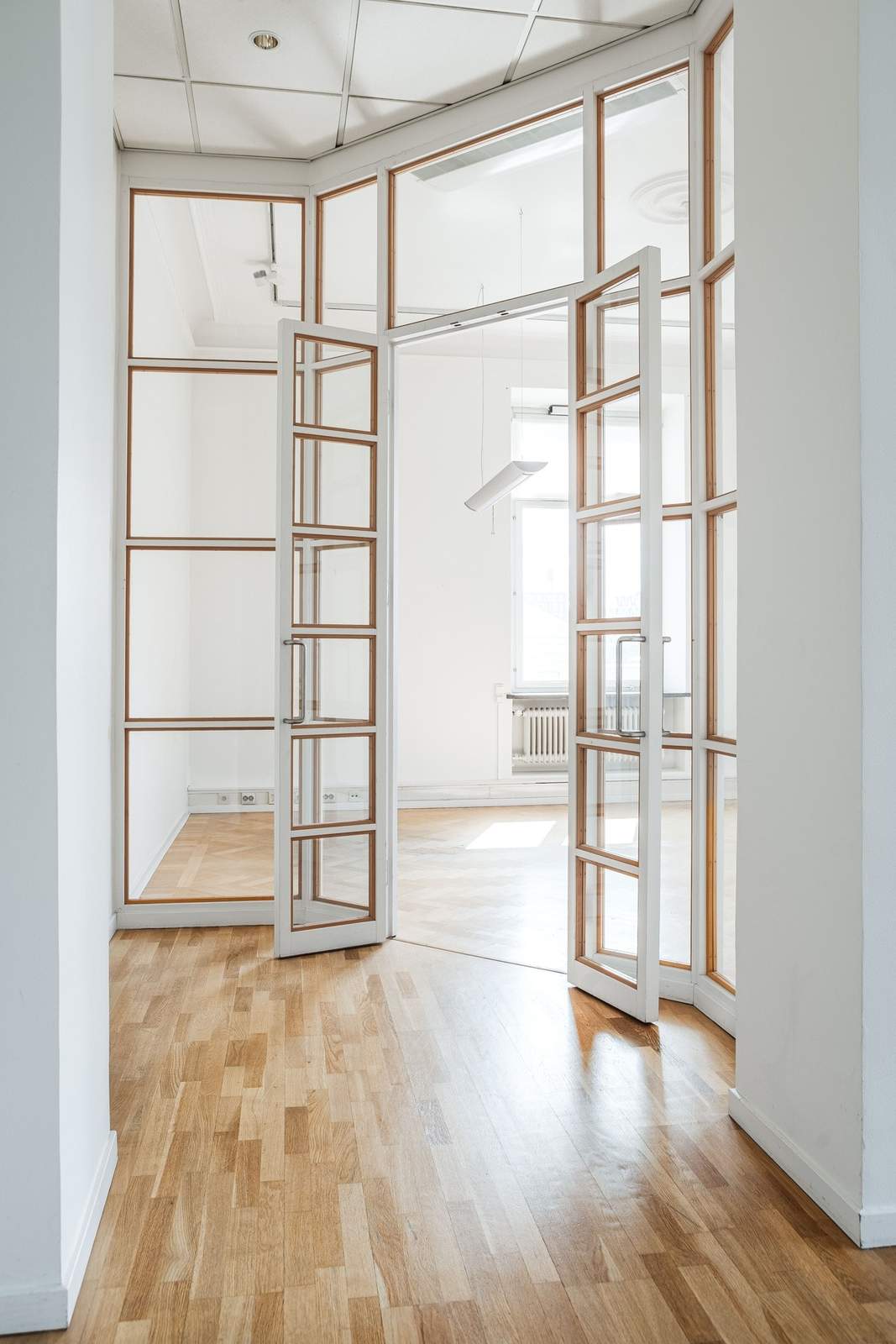 I entren möts man av en stor välkomnande hall, högt i tak och fint ljusinsläpp. Kontoret har gavelläge med fönster åt både syd och väst samt in mot innergården.