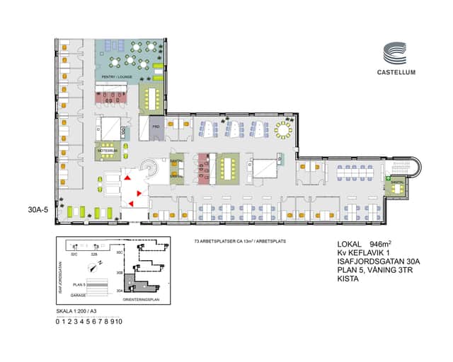 Lokalen omfattar 946 kvadratmeter och erbjuder en modern, välplanerad arbetsmiljö med god balans mellan öppna ytor och rum för fokus och möten. Här finns cirka 73 arbetsplatser, placerade i ljusa och luftiga zoner längs fasaden för att maximera dagsljus och skapa en trivsam arbetsro. Arbetsstationerna är organiserade i tydliga kluster som stödjer både samarbete och effektivitet i vardagen.