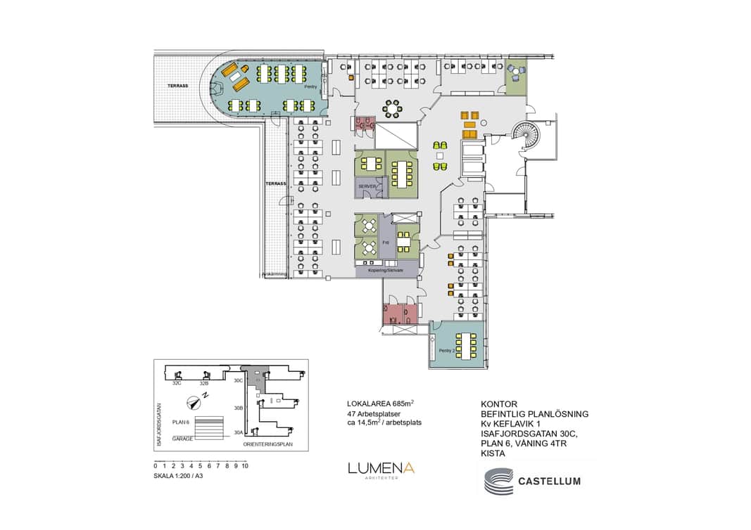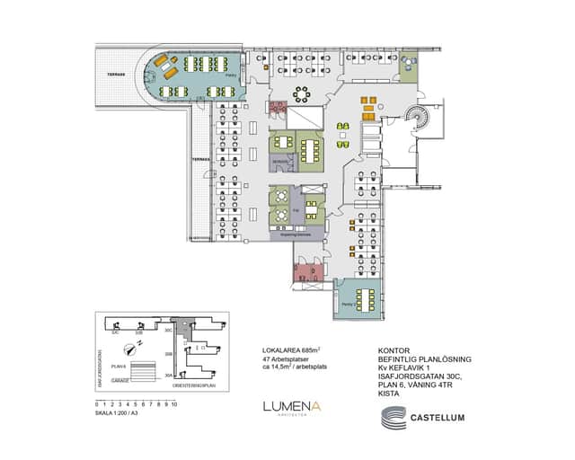 Lokalen har en blandad planlösning med såväl öppet landskap som rum som går att nyttja som både kontors- och konferensrum. Lokalens många fönster möjliggör för ett stort ljusinsläpp runt om i landskapet. I lokalen finns omklädningsrum med dusch. Lokalen har även två större egna terasser. Är det något du saknar eller behöver anpassa, hjälper vi dig såklart.