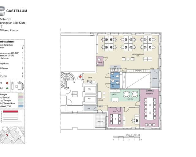 Mitt i lokalen ligger en pentry-/pausdel med sittgrupper som fungerar som socialt nav. Intill finns WC-grupp med 2 WC samt HWC/Dusch, praktiskt samlade nära kommunikationskärnan (hiss/trappa) för smidiga flöden.