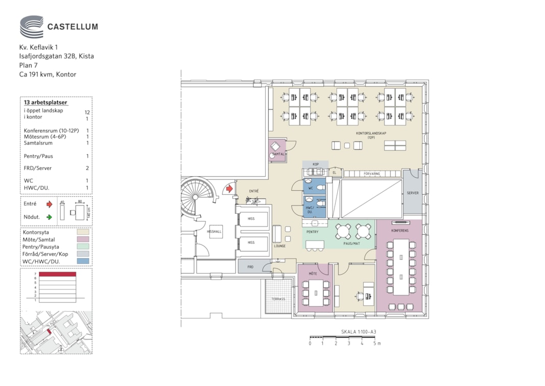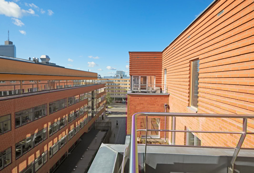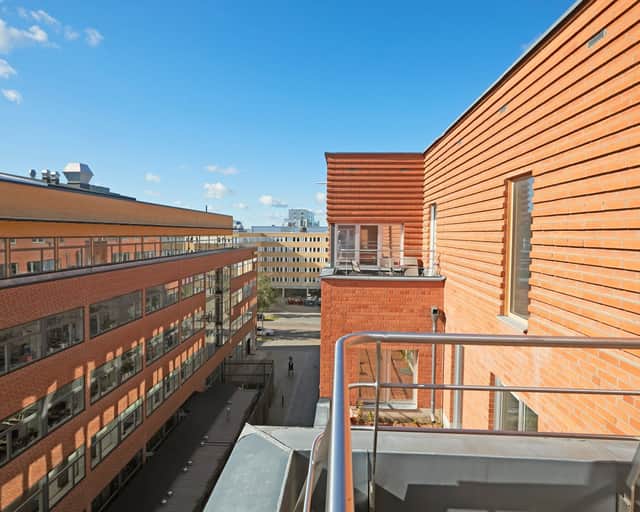 Högst upp i fastigheten är lokalen belägen med en egen liten terass och med alla de fönster som lokalen erbjuder tillkommer ett mycket fint ljusinsläpp från tre olika håll.