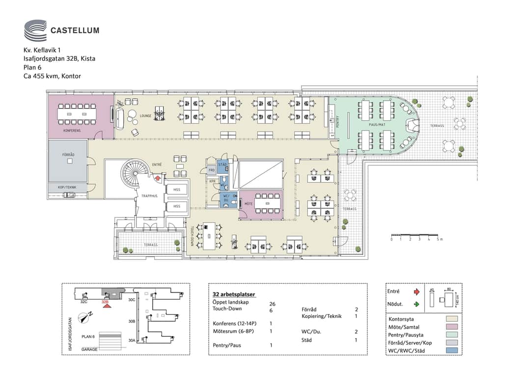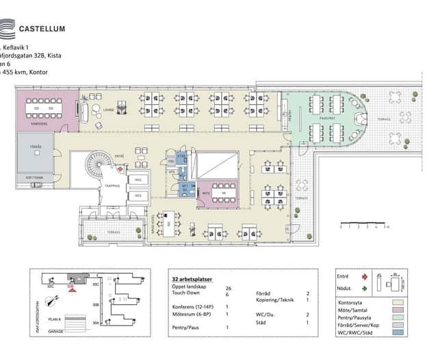 Denna kontorslokal om ca 455 kvm på plan 6 erbjuder en modern och välbalanserad planlösning med totalt 32 arbetsplatser. Merparten av arbetsplatserna är samlade i ett öppet landskap med 26 platser, kompletterat av 6 touch-down-platser för flexibelt och rörligt arbete. Längs fasaden ger stora fönster ett generöst ljusinsläpp över hela ytan.