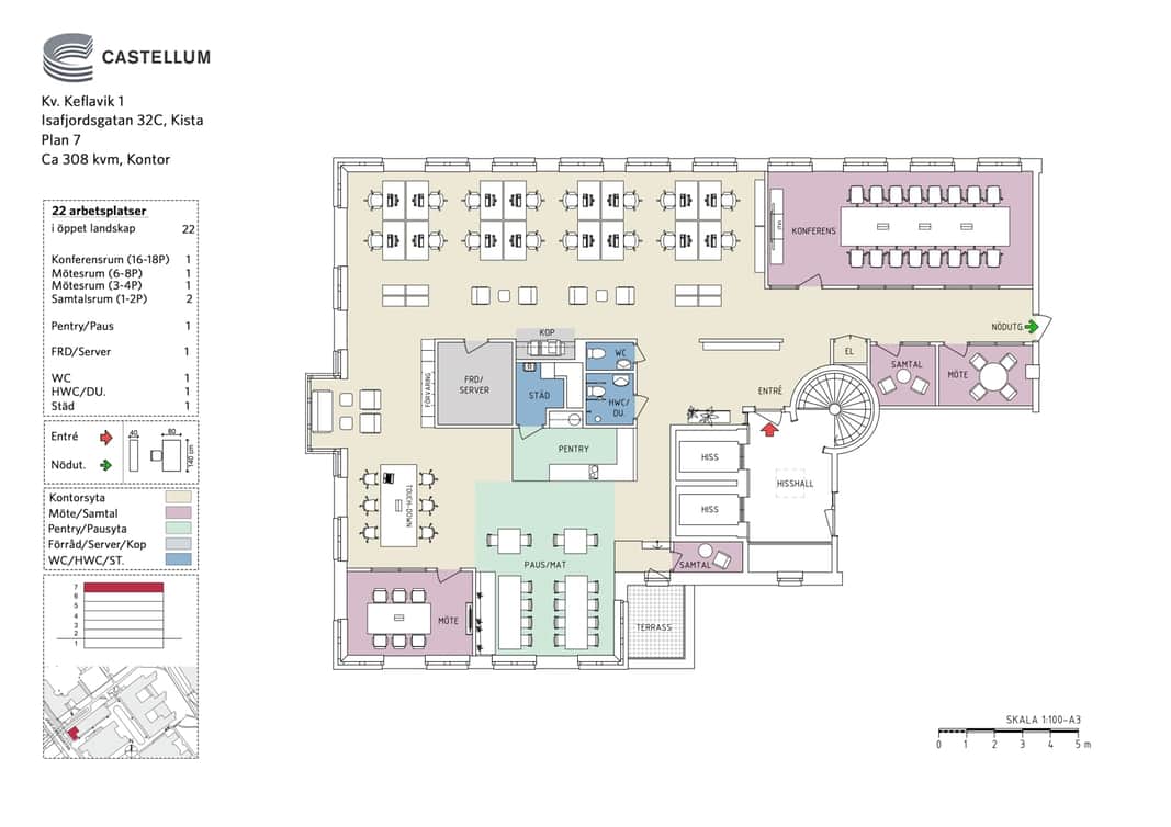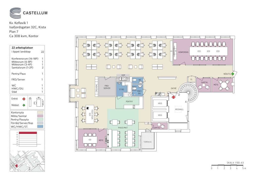 Strategiskt belägen i Kista, hjärtat av Stockholms teknologihub, erbjuder denna lokal närhet till företag, innovation och en dynamisk miljö. Kista är en idealisk plats för företag att växa, med en livfull stadsatmosfär och nära till shopping, restauranger och grönområden. Dessutom är det endast några minuters promenad till Kista tunnelbanestation, vilket gör pendlingen smidig för både anställda och besökare.