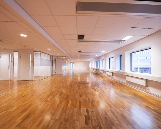 Lokalen har en interntrappa till övre plan som bjuder på öppna, flexibla ytor med fönster mot innergård och Gullfossgatan.