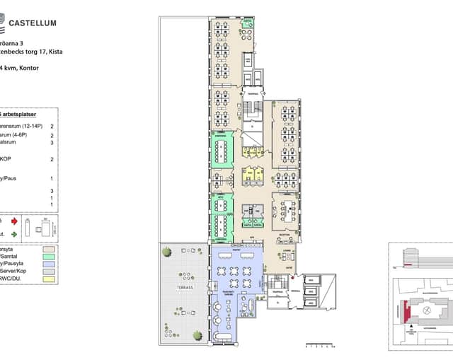 Centralt i lokalen finns en generös pentry- och pausdel som fungerar som en naturlig samlingspunkt och ligger i direkt anslutning till en stor terrass, perfekt för luncher eller möten utomhus. I anslutning till kärnan finns flera mötesrum – ett större konferensrum för 12–14 personer, två mötesrum för 6–8 personer samt tre samtalsrum för 2 personer. Dessa kompletteras av en flexibel yta för informella möten och samarbete.