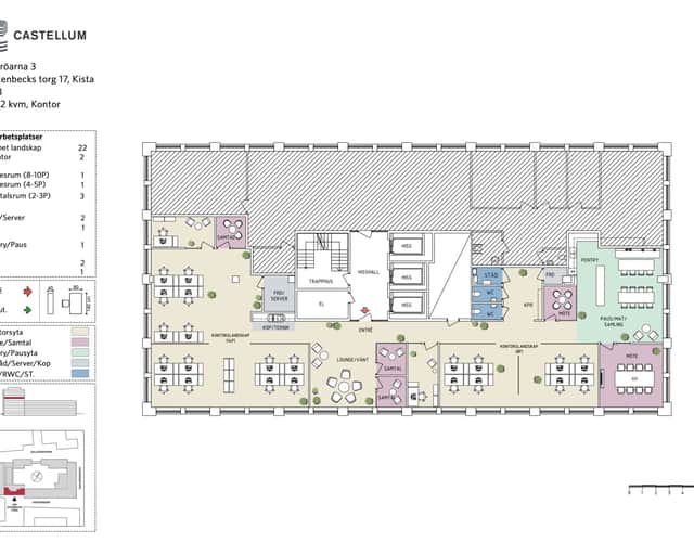 Planlösningen består av ett öppet kontorslandskap kompletterat med flera mötes- och samtalsrum samt sociala ytor placerade kring den centrala trapp- och hisskärnan. Längs fönsterlinjerna finns arbetsplatser medan pentry, pausytor och stödutrymmen samlas i den högra delen av lokalen.