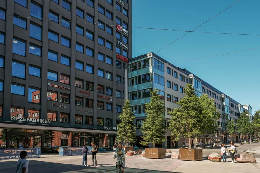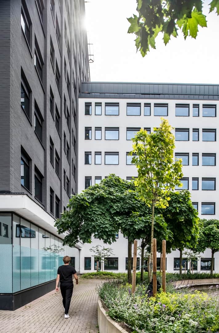 Den gröna innergården bjuder in till pauser och informella möten, med gott om sittplatser och en trevlig terrassmiljö.