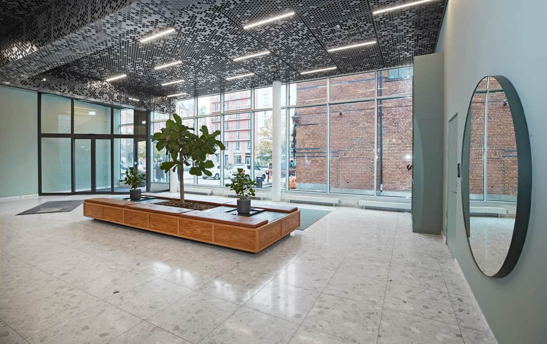 I samma trappuppgång finns gemensamma omklädningsrum med duschar i källarplanet, vilket är perfekt för den som vill träna på lunchen eller cykla till jobbet.