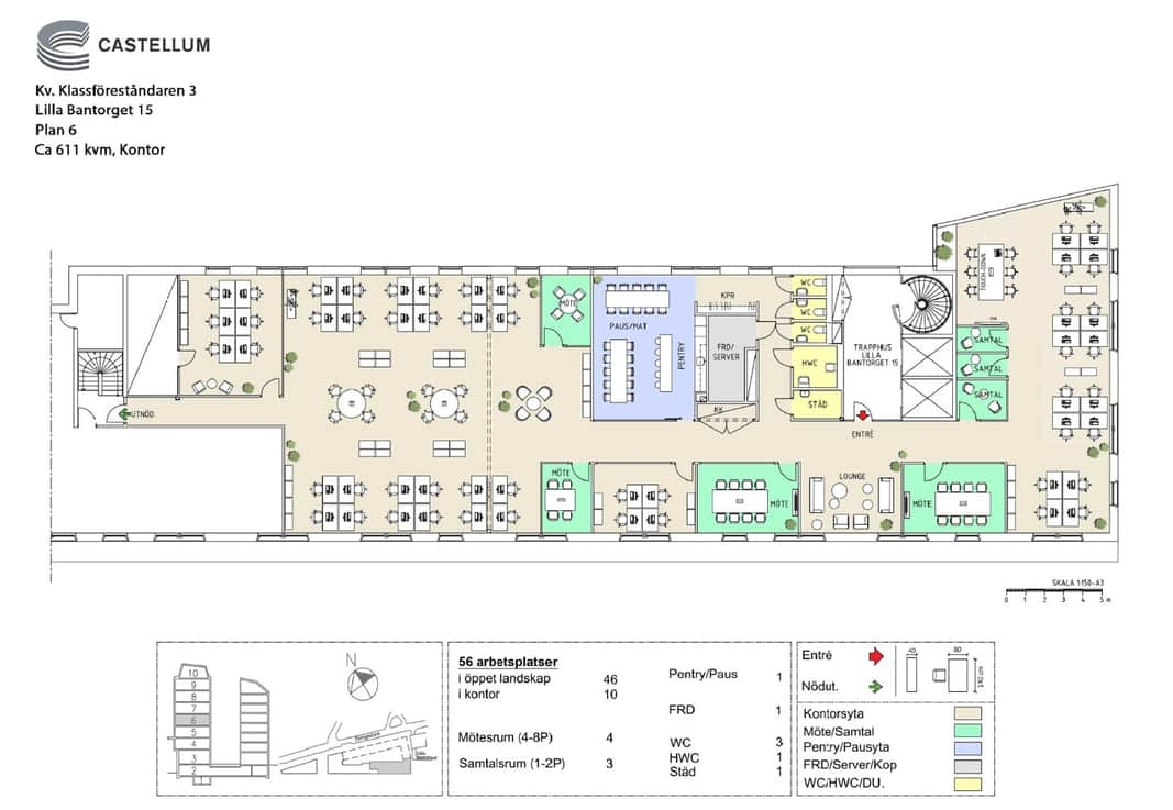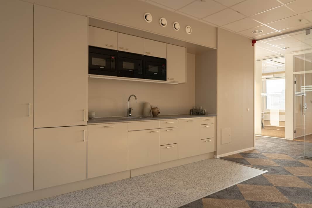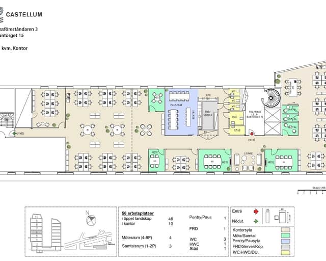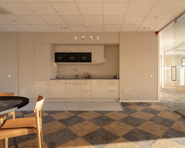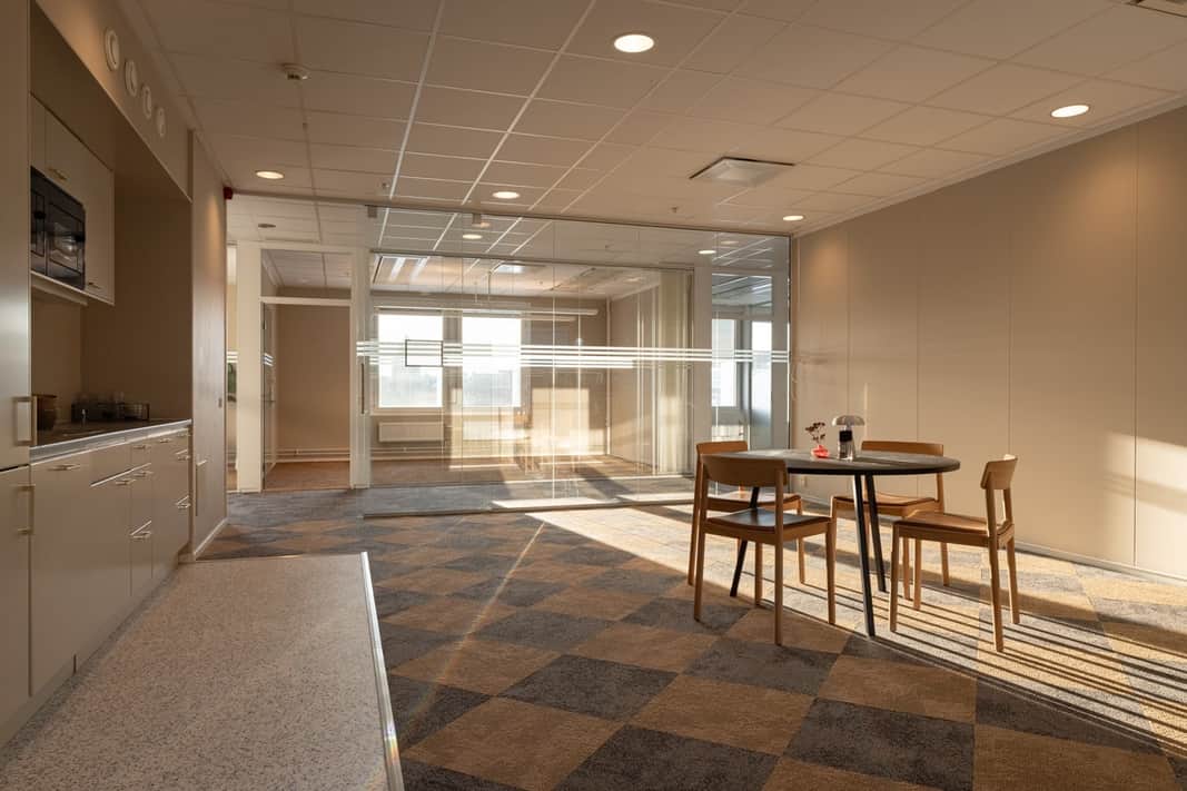 Här finns det plats för 42 arbetsplatser, konferensrum i olika storlekar. Kontoret erbjuder en magnifik utsikt över Kungsholmen och Klara sjö. Lokalernas öppna yta, stora fönsterpartier och representativa entré gör det lätt att skapa en attraktiv miljö för både medarbetare och kunder.