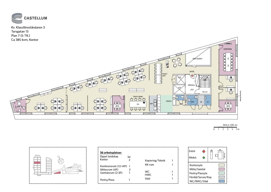 Lokalens planlösning är till mestadels öppen med mötesrum samt möjliga kontorssrum i bakkant. Utformingen är unik med fönster från alla håll och ett vackert möterum i spetsen med utsikt.