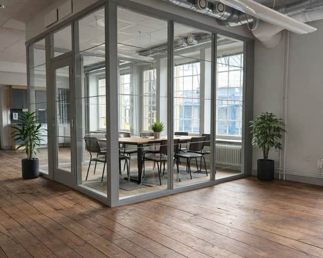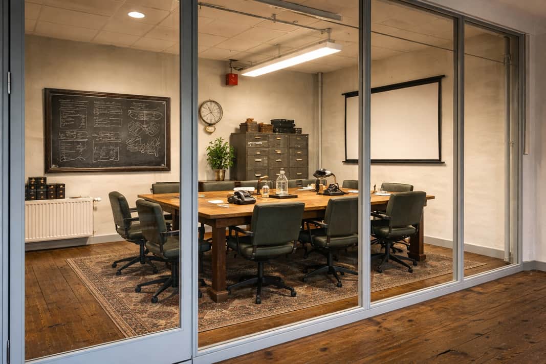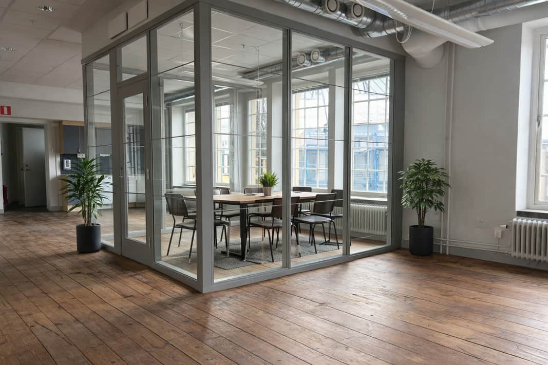 Lokalen har en öppen planlösning med genuina trägolv och mycket ljusinsläpp från de vackra spröjsade fönstrena. Konferensrum och tystrum med glasväggar och vackra detaljer.