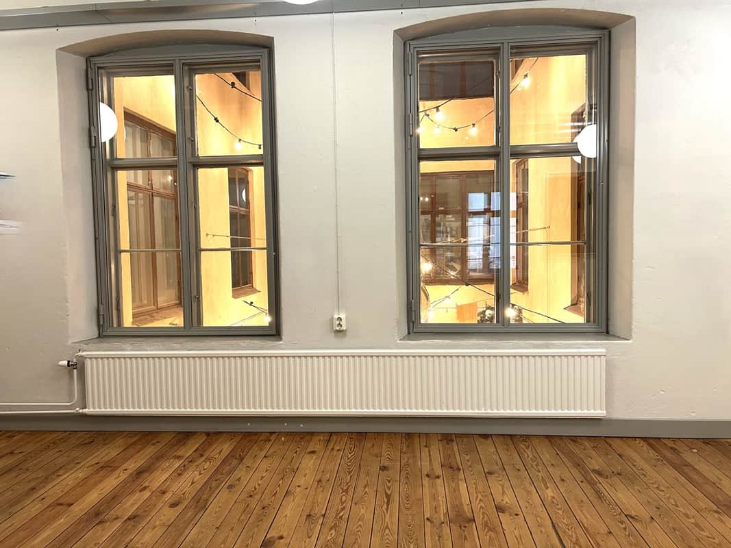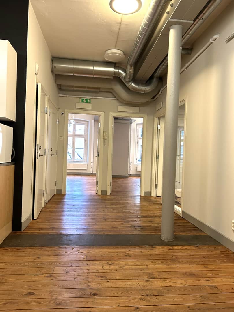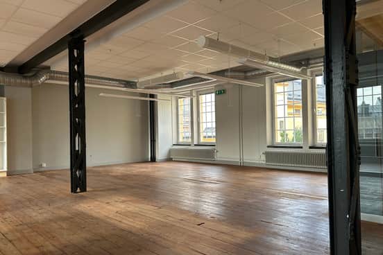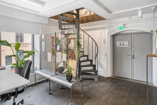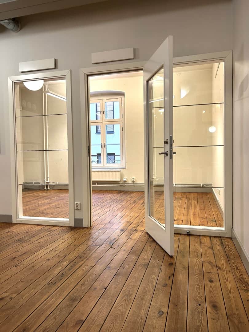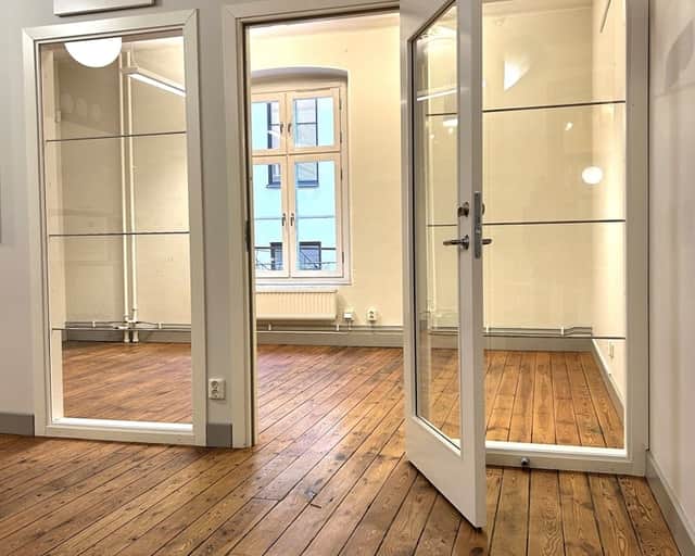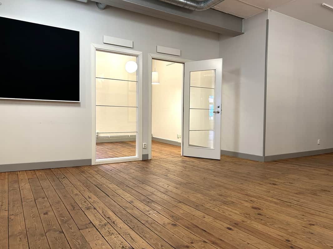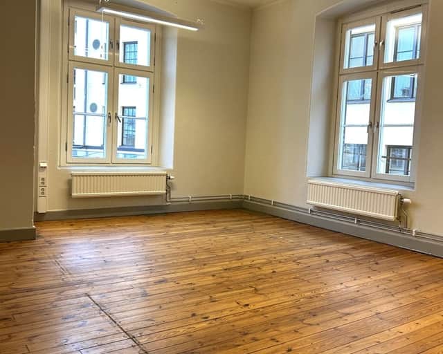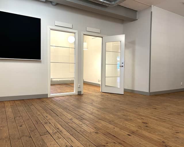 En fin hörnlokal med genuina trägolv, generösa fönster med en med rum där man kan arbeta enskilt eller i grupp. En härlig ljusgård vetter mot ena hållet och det andra hållet med utsikt över restaurangtorget i Knäppingsborg.