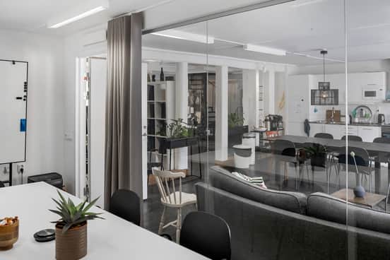 Vid entrén möts man av en öppen gemensamhets del där en kort stund av gemenskap stärker samarbetet och gör det lättare att möta dagens utmaningar tillsammans. Genom att investera i en bra start blir arbetet i rummen mer fokuserat, effektivt och inspirerat.