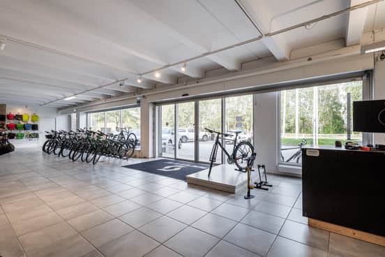 Stor öppen butiksyta, omklädningsrum med dusch, kontorsrum, mötesyta och gemensamhetsytor.