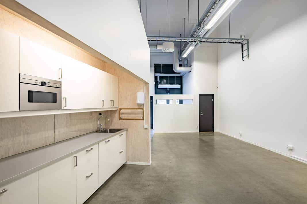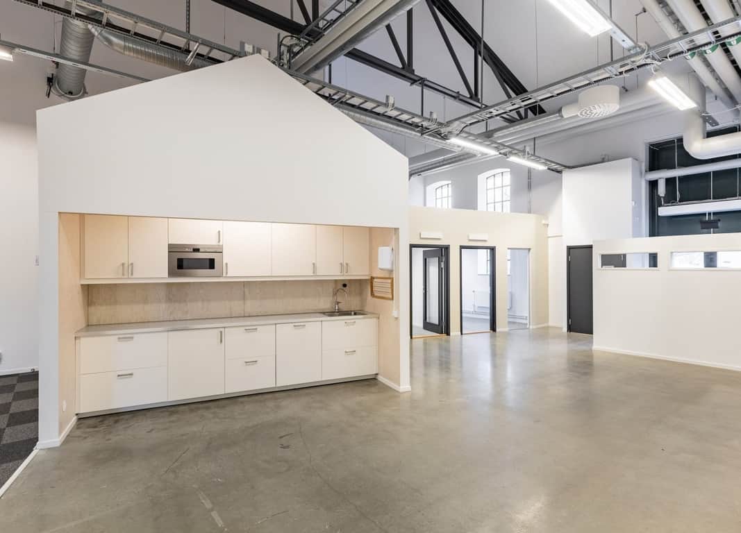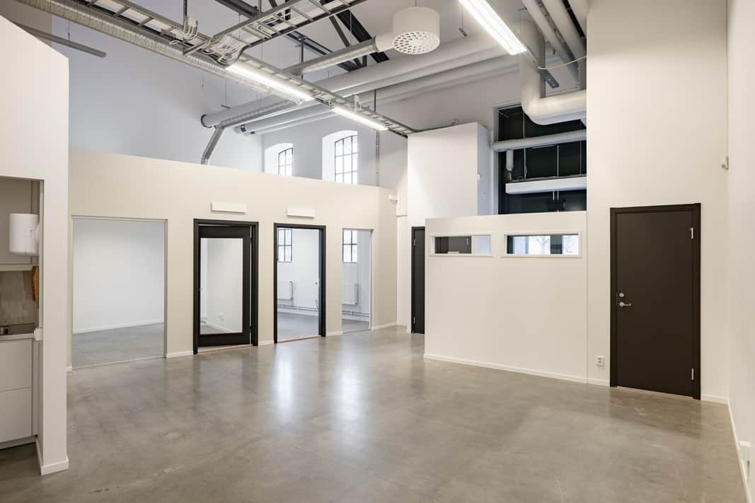 Lokalen har en unik planlösning med högt i tak i de gemensamma ytorna, vilket ger en luftig och representativ känsla. Den genomtänkta utformningen erbjuder flexibilitet för olika verksamheter – perfekt för såväl kontor som kreativ studio eller showroom.