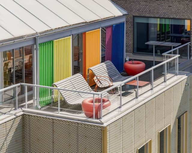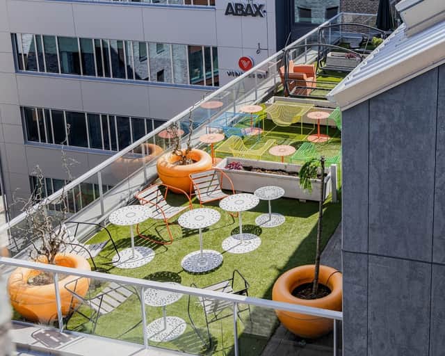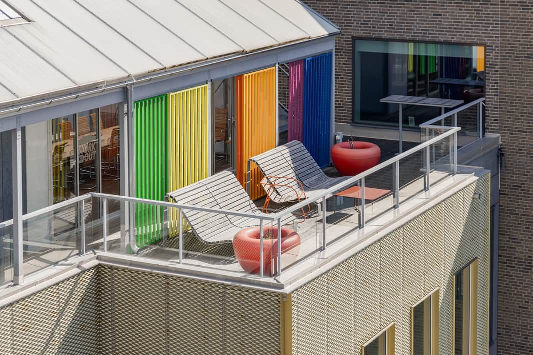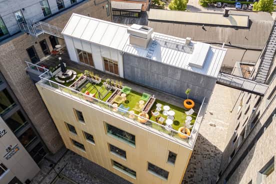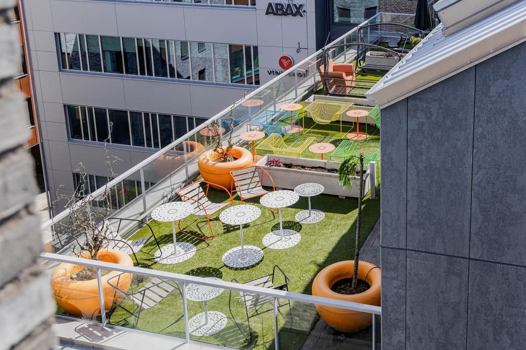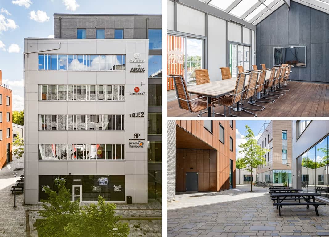 På byggnadens tak finns även en gemenam terass med utomhuskonferens där det går lika bra att ta ett möte som att avnjuta sin lunch i solen.