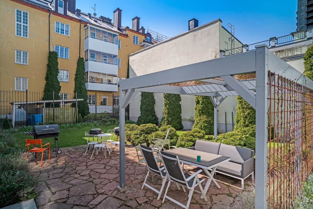Ett välutrustat pentry för enkel tillagning av måltider och två toaletter för bekvämlighet. Dessutom har du tillgång till vackra gröna innergård, perfekt för avkoppling och kreativitet.