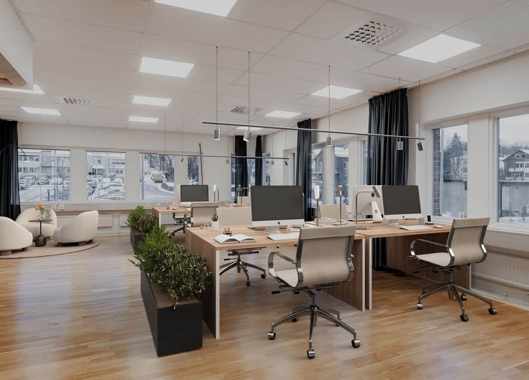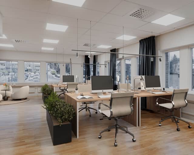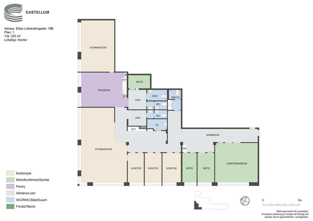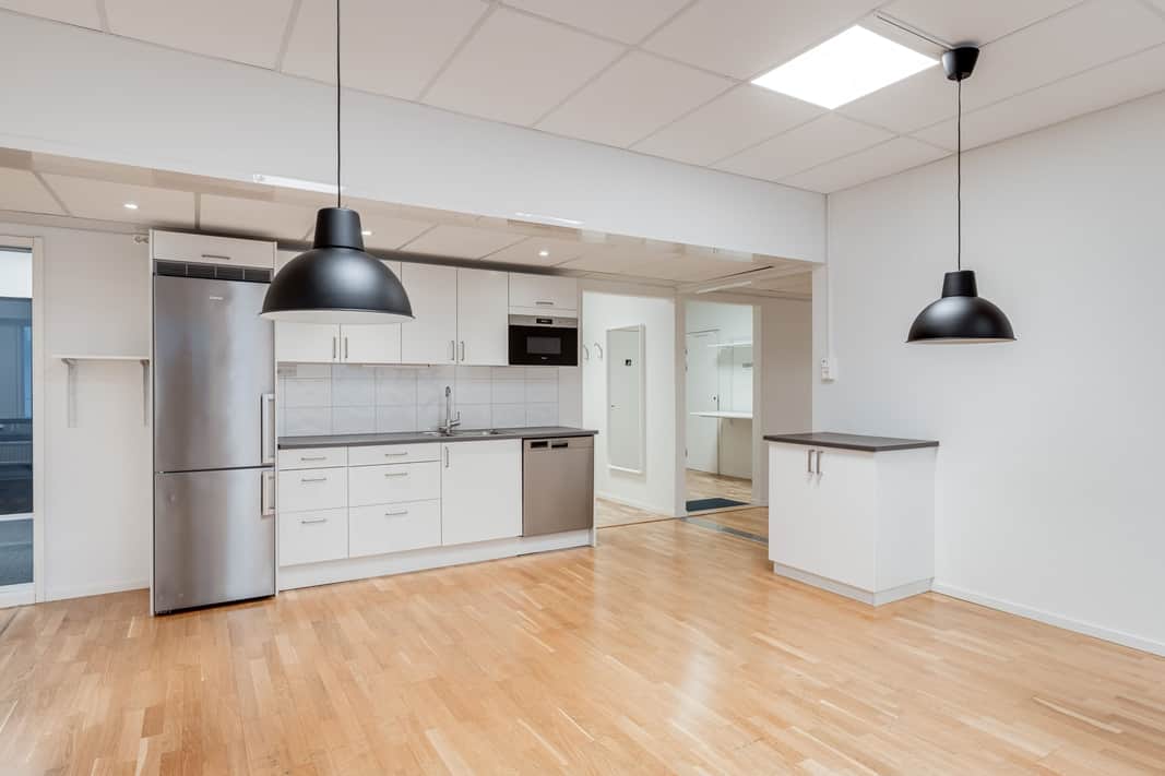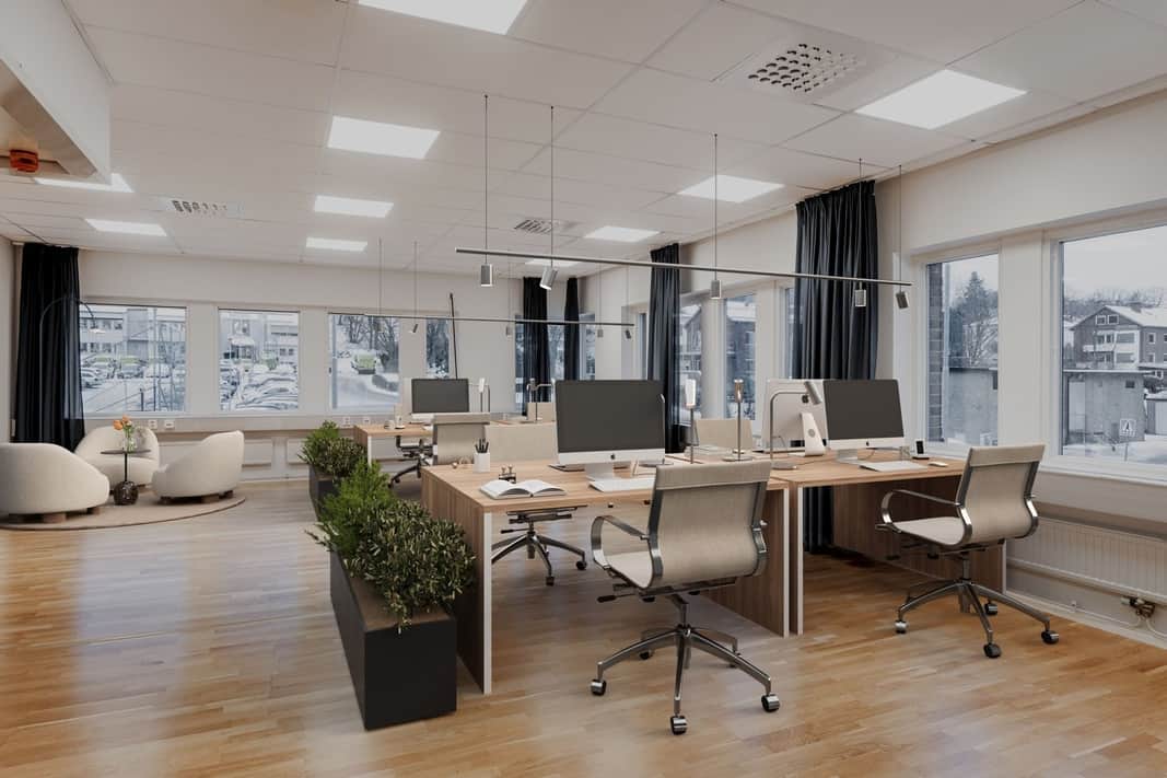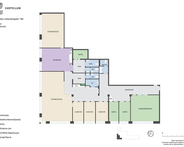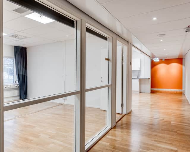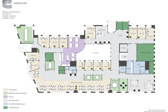 Blandad planlösning med kontor och öppna ytor samt gemensamhetsytor.