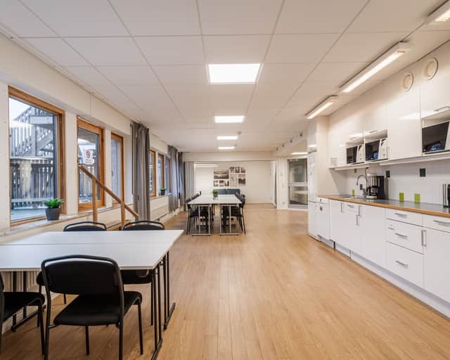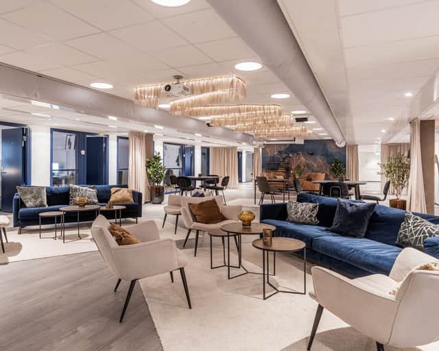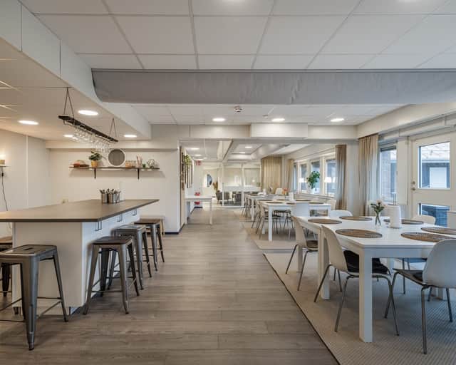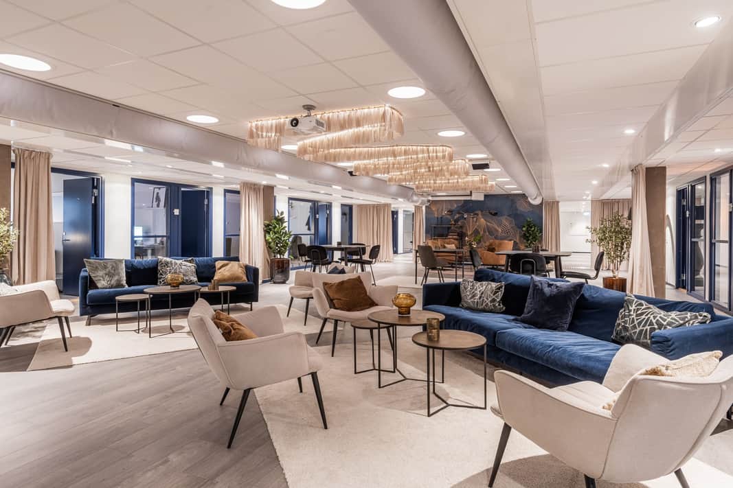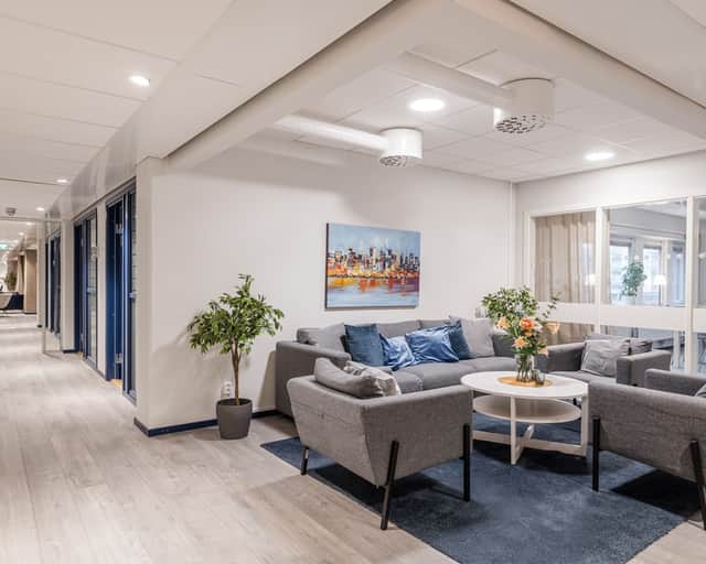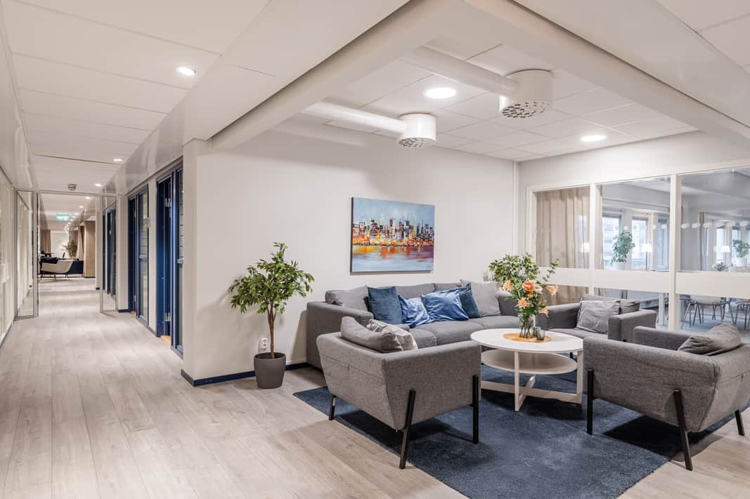 Enskilda kontorsrum, öppna loungeytor, rymligt kök och egen terrass.