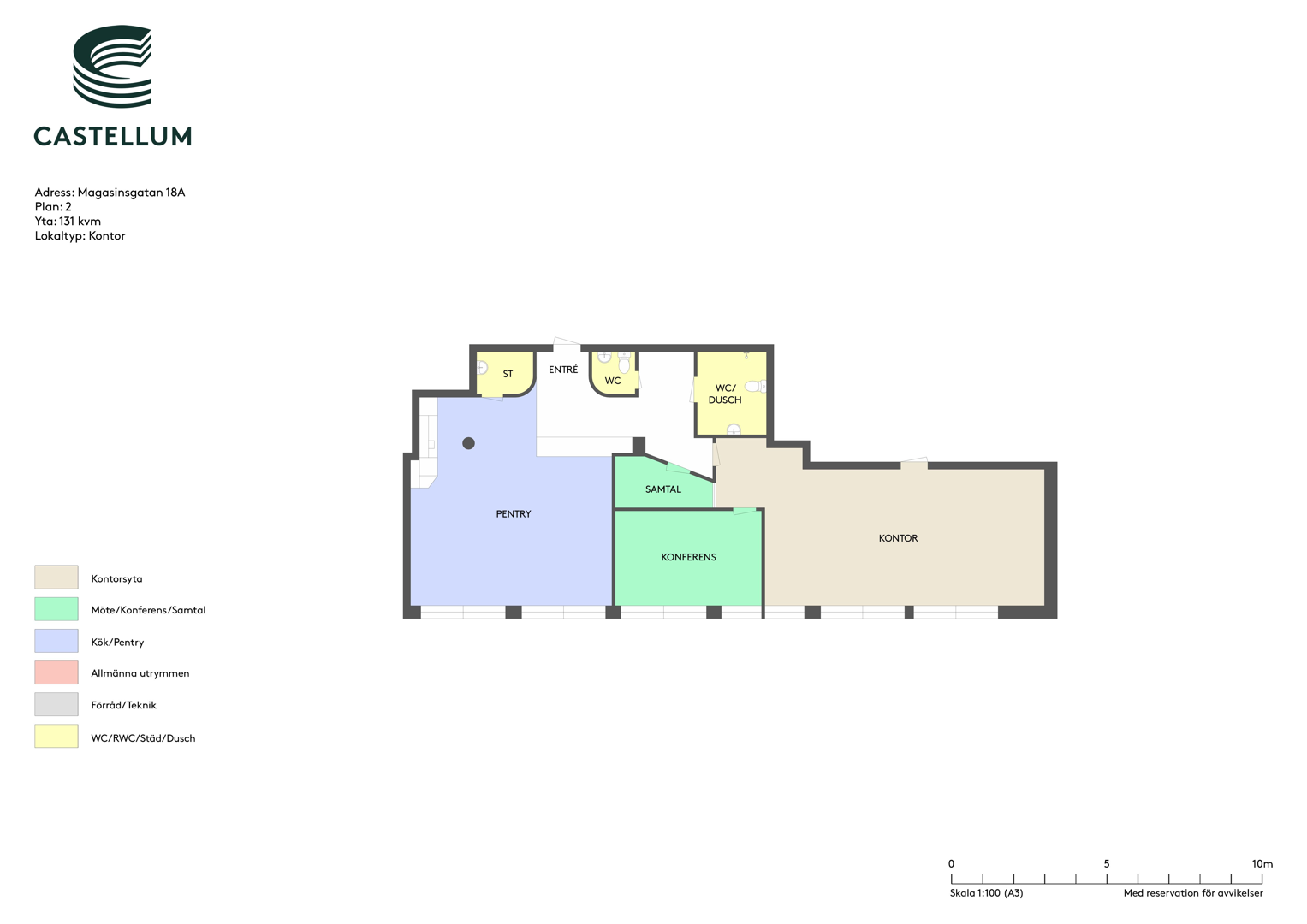 Kontoret har idag en öppen planlösning med ett mötesrum, ett samtalsrum, pentry och två wc varav en med dusch. Hiss finns från markplan.